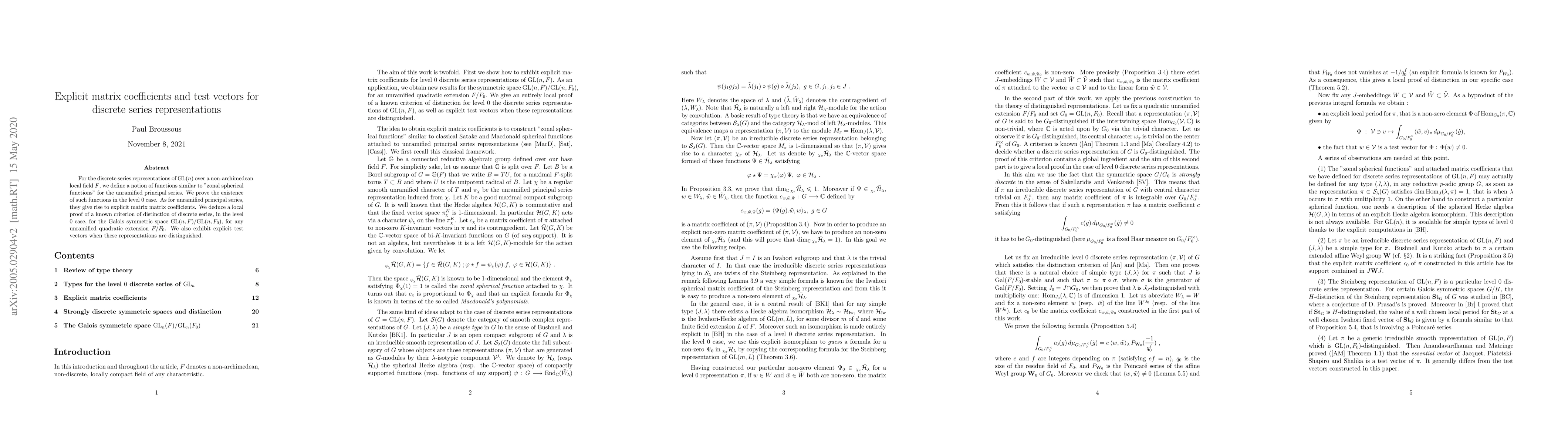 This paper defines functions analogous to zonal spherical functions for the discrete series representations of ${\rm GL}(n)$ over a non-archimedean local field, proving their existence in the level $0$ case. It provides explicit matrix coefficients and test vectors, leading to a local proof of Matringe's criterion for distinguishing discrete series in unramified quadratic extensions.