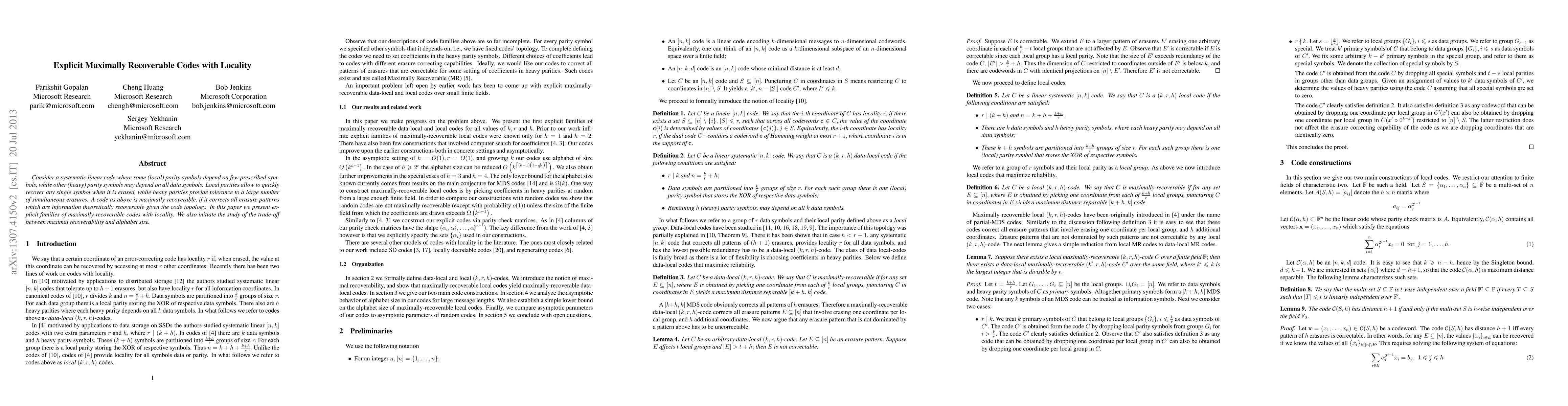 This paper presents explicit families of maximally recoverable linear codes with locality, where some parity symbols allow quick recovery of single erased symbols while others provide tolerance to multiple erasures. It also explores the trade-off between maximal recoverability and the size of the code alphabet.