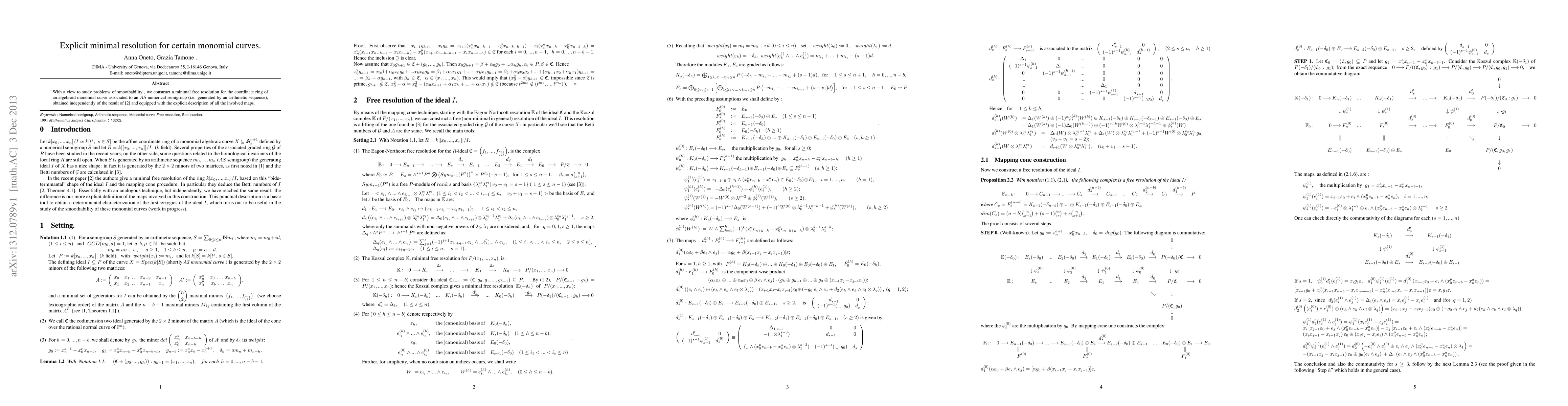 With a view to study problems of smoothability, we construct a minimal free resolution for the coordinate ring of an algebroid monomial curve associated to an $AS$ numerical semigroup (i.e. generated by an arithmetic sequence), obtained independently of the result of \cite{gss2} and equipped with the explicit description of all the involved maps.