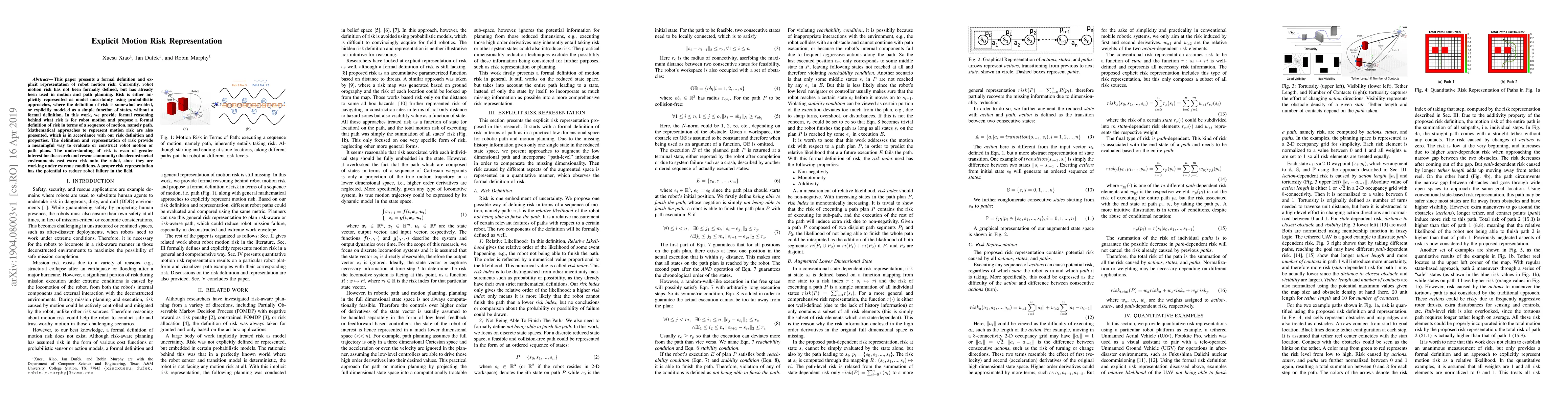 This paper defines robot motion risk formally and provides a representation to evaluate or construct path plans, with potential applications in search and rescue operations.