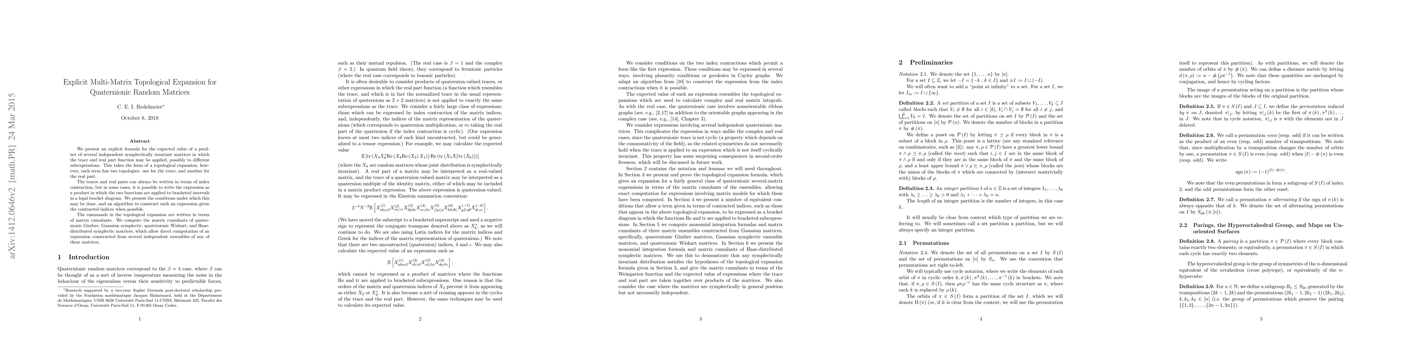 We present an explicit formula for the expected value of a product of several independent symplectically invariant matrices in which the trace and real part function may be applied, possibly to different subexpressions. This takes the form of a topological expansion; however, each term has two topologies: one for the trace, and another for the real part. The traces and real parts can always be written in terms of index contraction, but in some cases, it is possible to write the expression as a product in which the two functions are applied to bracketed intervals in a legal bracket diagram. We present the conditions under which this may be done, and an algorithm to construct such an expression given the contracted indices when possible. The summands in the topological expansion are written in terms of matrix cumulants. We compute the matrix cumulants of quaternionic Ginibre, Gaussian symplectic, quaternionic Wishart, and Haar-distributed symplectic matrices, which allow direct computation of an expression constructed from several independent ensembles of any of these matrices.