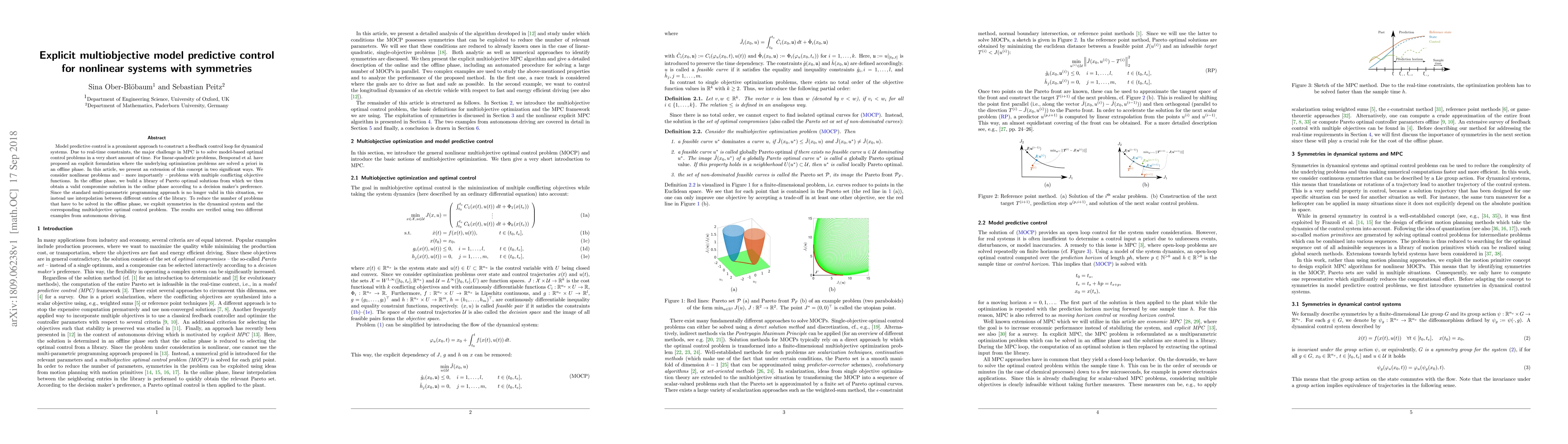 This paper extends explicit multiobjective model predictive control for nonlinear systems with symmetries, solving offline optimization problems to generate a library of Pareto optimal solutions for real-time online compromise decisions based on user preferences. Symmetry exploitation reduces offline problem complexity, validated by autonomous driving examples.