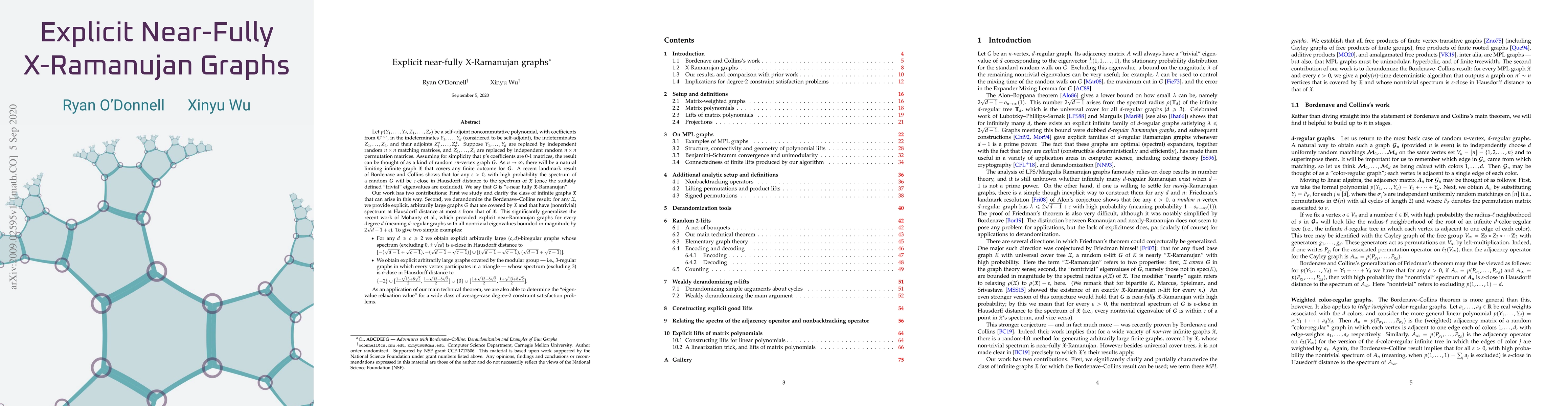 Let $p(Y_1, \dots, Y_d, Z_1, \dots, Z_e)$ be a self-adjoint noncommutative polynomial, with coefficients from $\mathbb{C}^{r \times r}$, in the indeterminates $Y_1, \dots, Y_d$ (considered to be self-adjoint), the indeterminates $Z_1, \dots, Z_e$, and their adjoints $Z_1^*, \dots, Z_e^*$. Suppose $Y_1, \dots, Y_d$ are replaced by independent random $n \times n$ matching matrices, and $Z_1, \dots, Z_e$ are replaced by independent random $n \times n$ permutation matrices. Assuming for simplicity that $p$'s coefficients are $0$-$1$ matrices, the result can be thought of as a kind of random $rn$-vertex graph $G$. As $n \to \infty$, there will be a natural limiting infinite graph $X$ that covers any finite outcome for $G$. A recent landmark result of Bordenave and Collins shows that for any $\varepsilon > 0$, with high probability the spectrum of a random $G$ will be $\varepsilon$-close in Hausdorff distance to the spectrum of $X$ (once the suitably defined "trivial" eigenvalues are excluded). We say that $G$ is "$\varepsilon$-near fully $X$-Ramanujan". Our work has two contributions: First we study and clarify the class of infinite graphs $X$ that can arise in this way. Second, we derandomize the Bordenave-Collins result: for any $X$, we provide explicit, arbitrarily large graphs $G$ that are covered by $X$ and that have (nontrivial) spectrum at Hausdorff distance at most $\varepsilon$ from that of $X$. This significantly generalizes the recent work of Mohanty et al., which provided explicit near-Ramanujan graphs for every degree $d$ (meaning $d$-regular graphs with all nontrivial eigenvalues bounded in magnitude by $2\sqrt{d-1} + \varepsilon$). As an application of our main technical theorem, we are also able to determine the "eigenvalue relaxation value" for a wide class of average-case degree-$2$ constraint satisfaction problems.