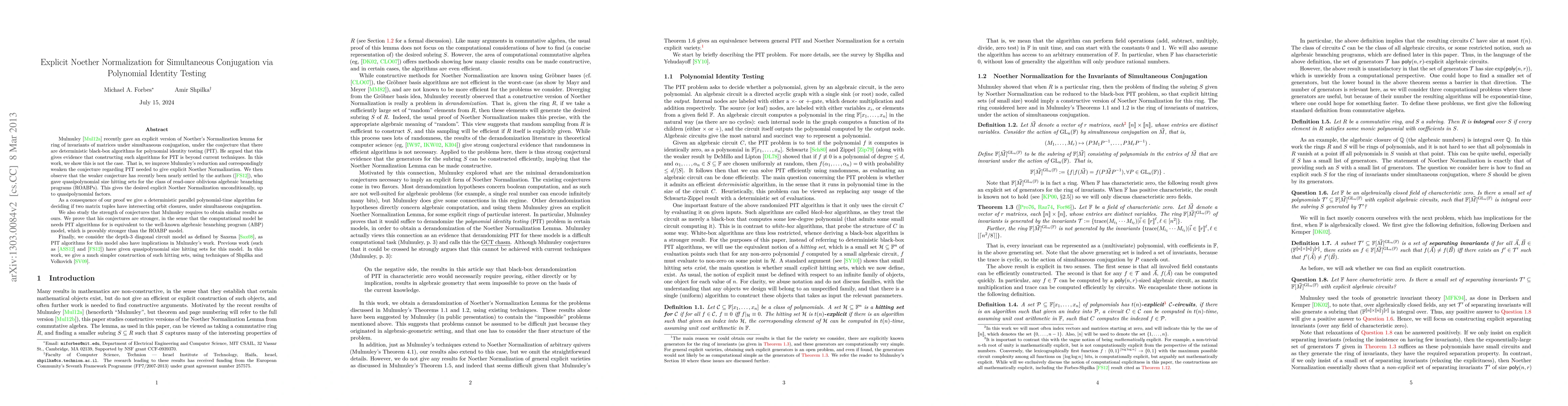 Researchers prove that explicit Noether Normalization can be achieved with quasipolynomial factors, improving on a previous conjecture, and demonstrate a deterministic parallel algorithm for checking intersecting orbit closures under simultaneous conjugation.