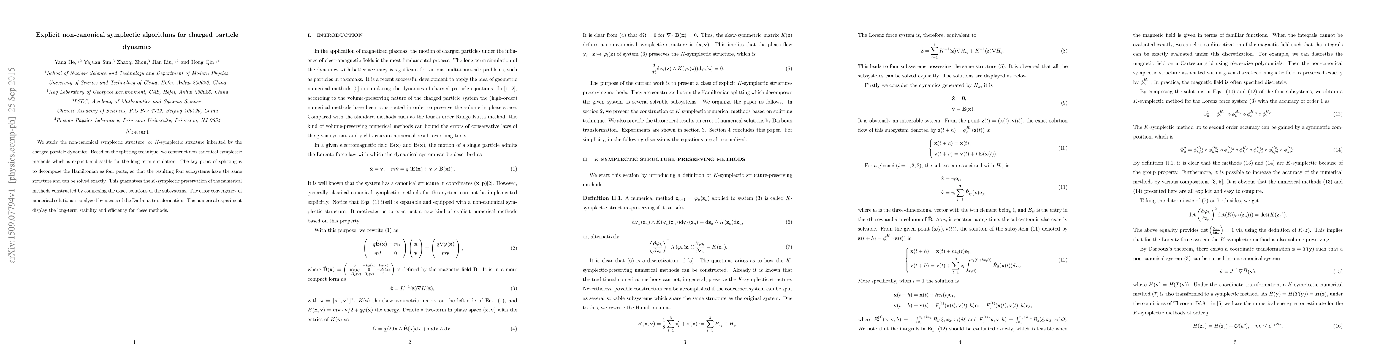 We study the non-canonical symplectic structure, or K-symplectic structure inherited by the charged particle dynamics. Based on the splitting technique, we construct non-canonical symplectic methods which is explicit and stable for the long-term simulation. The key point of splitting is to decompose the Hamiltonian as four parts, so that the resulting four subsystems have the same structure and can be solved exactly. This guarantees the K-symplectic preservation of the numerical methods constructed by composing the exact solutions of the subsystems. The error convergency of numerical solutions is analyzed by means of the Darboux transformation. The numerical experiment display the long-term stability and efficiency for these methods.
