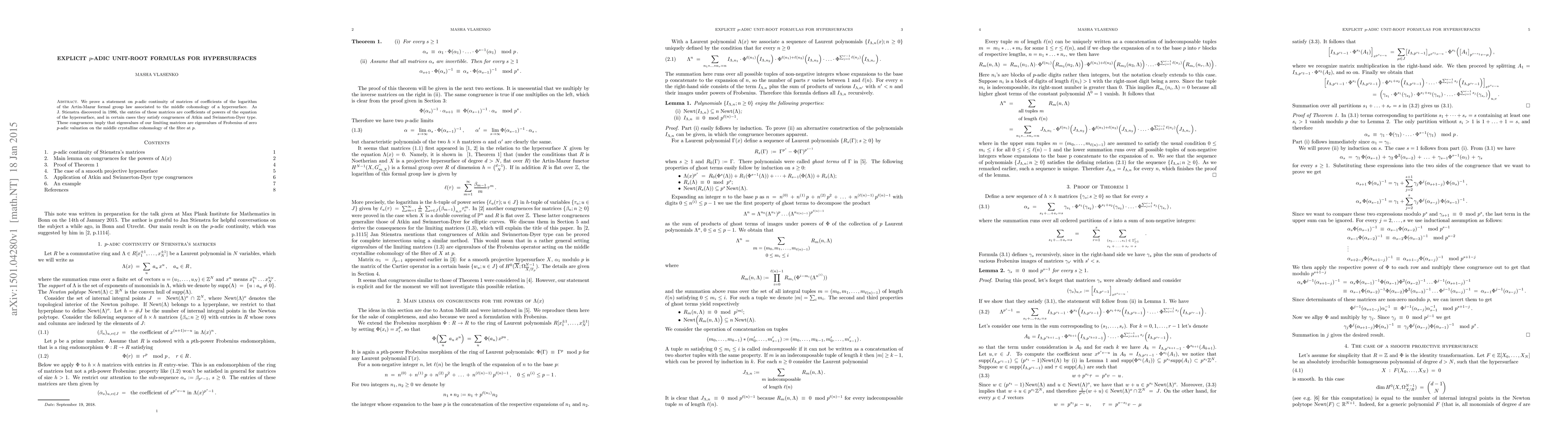 We prove a statement on p-adic continuity of matrices of coefficients of the logarithm of the Artin-Mazur formal group law associated to the middle cohomology of a hypersurface. As Jan Stienstra discovered in 1986, the entries of these matrices are coefficients of powers of the equation of the hypersurface, and in certain cases they satisfy congruences of Atkin and Swinnerton-Dyer type. These congruences imply that eigenvalues of our limiting matrices are eigenvalues of Frobenius of zero p-adic valuation on the middle crystalline cohomology of the fibre at p.