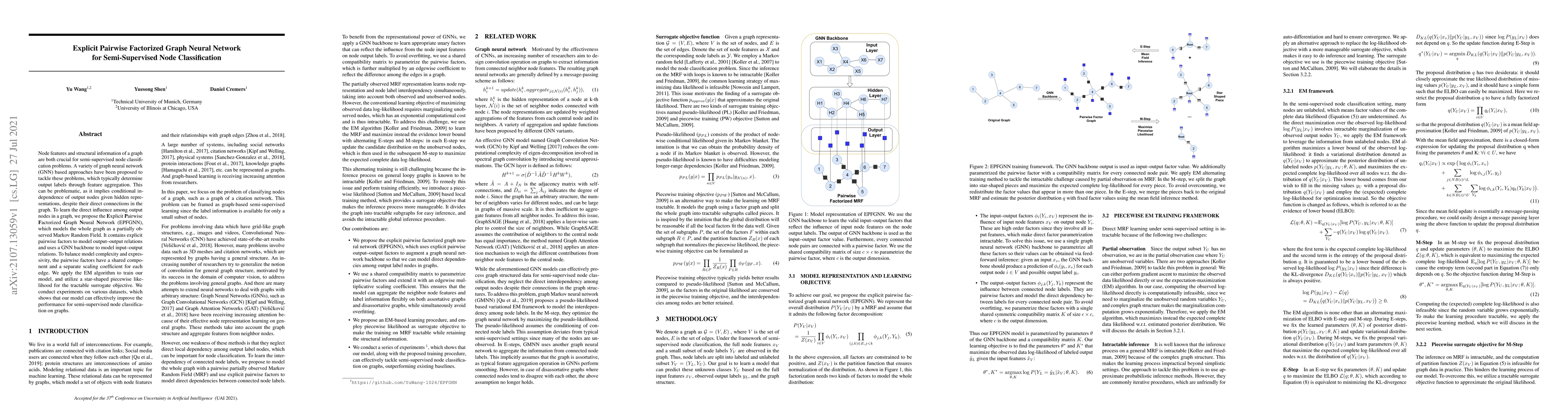 The paper proposes the Explicit Pairwise Factorized Graph Neural Network (EPFGNN) to enhance semi-supervised node classification by modeling direct influence among output nodes through explicit pairwise factors, while using a GNN backbone for input-output relations. Experiments show that the model improves classification performance on various datasets.