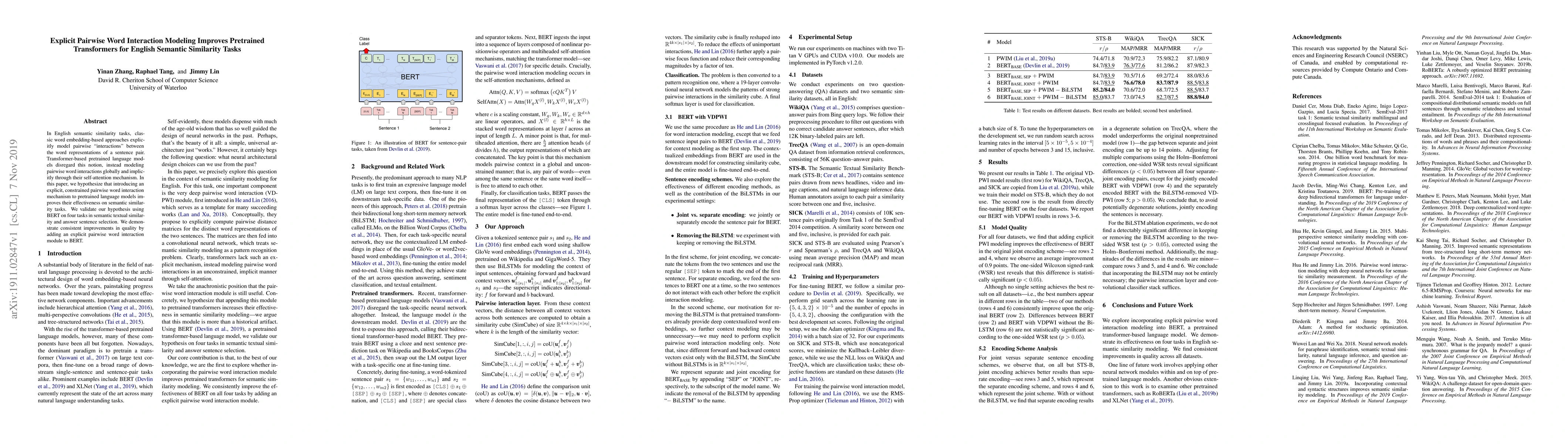 This paper proposes an explicit pairwise word interaction mechanism to enhance pretrained Transformers for English semantic similarity tasks, showing consistent improvements over BERT in various semantic textual similarity and answer sentence selection tasks. The addition of this module demonstrates better performance by explicitly modeling word interactions.