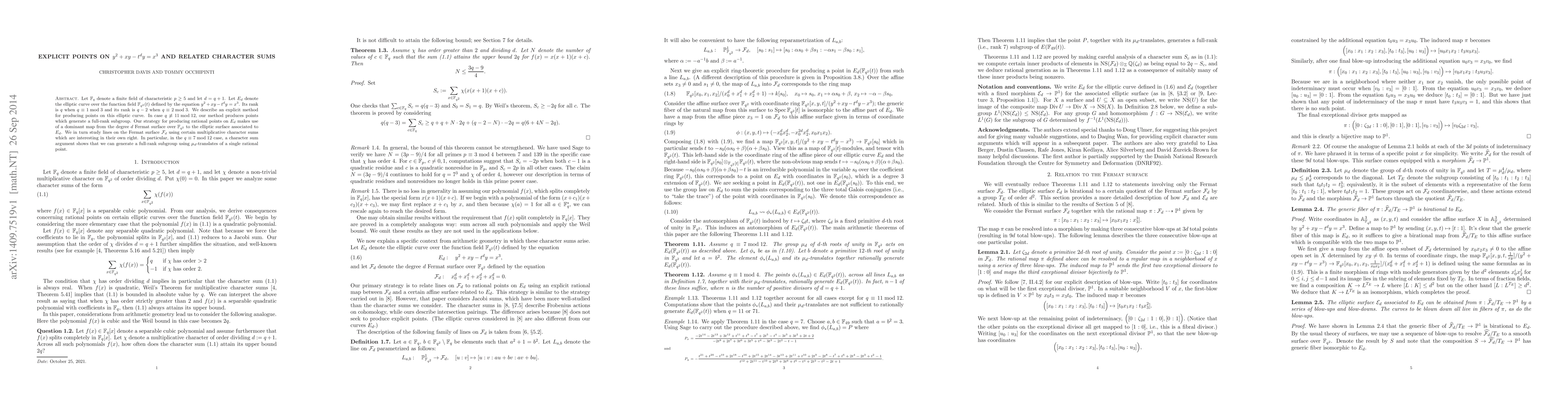 Let $\mathbb{F}_q$ denote a finite field of characteristic $p \geq 5$ and let $d = q+1$. Let $E_d$ denote the elliptic curve over the function field $\mathbb{F}_{q^2}(t)$ defined by the equation $y^2 + xy - t^d y = x^3$. Its rank is $q$ when $q \equiv 1 \bmod 3$ and its rank is $q-2$ when $q \equiv 2 \bmod 3$. We describe an explicit method for producing points on this elliptic curve. In case $q \not\equiv 11 \bmod 12$, our method produces points which generate a full-rank subgroup. Our strategy for producing rational points on $E_d$ makes use of a dominant map from the degree $d$ Fermat surface over $\mathbb{F}_{q^2}$ to the elliptic surface associated to $E_d$. We in turn study lines on the Fermat surface $\mathcal{F}_d$ using certain multiplicative character sums which are interesting in their own right. In particular, in the $q \equiv 7 \bmod 12$ case, a character sum argument shows that we can generate a full-rank subgroup using $\mu_d$-translates of a single rational point.