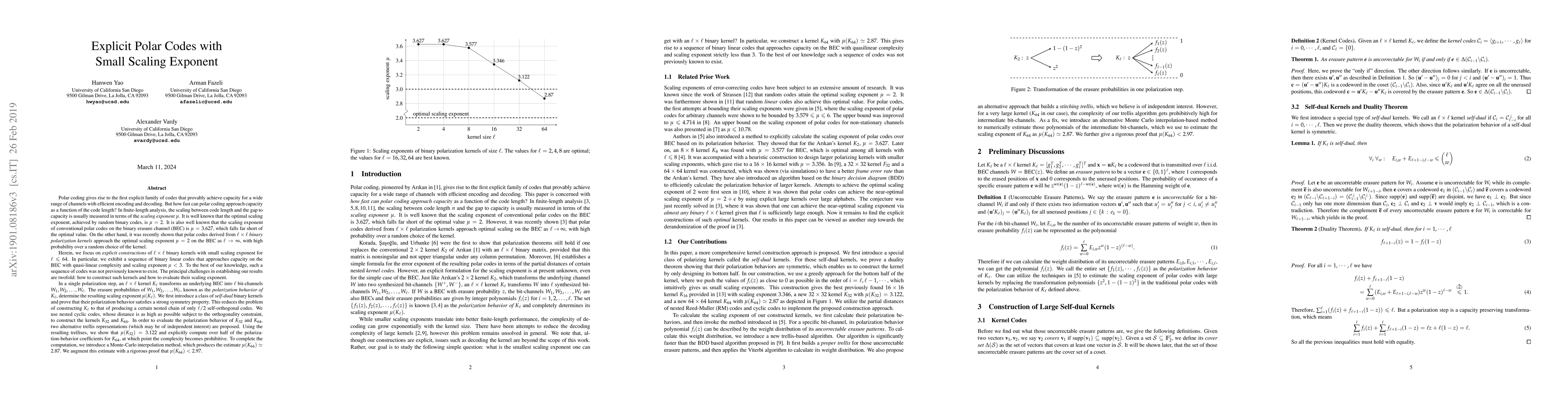 This paper presents explicit constructions of binary linear codes with small scaling exponents for $\ell \leq 64$, achieving quasi-linear complexity and a scaling exponent $\mu < 3$. The authors introduce a class of self-dual binary kernels and propose a Monte-Carlo method to estimate their scaling exponent, achieving $\mu(K_{64}) \simeq 2.87$ with rigorous bounds.