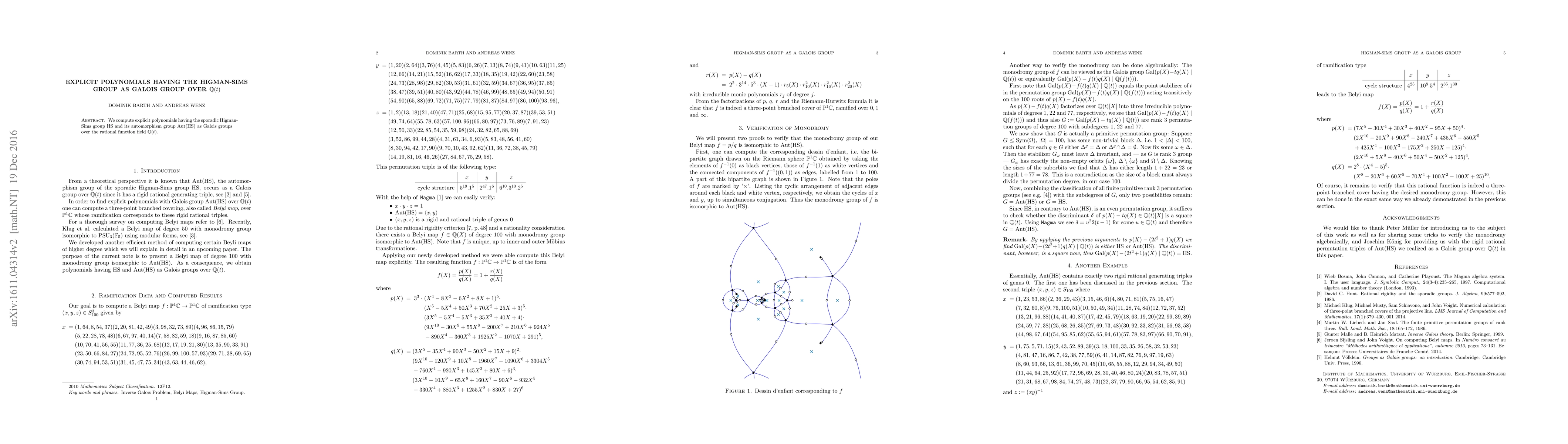 Summary: This paper provides explicit polynomials whose Galois groups over the rational function field Q(t) are the sporadic Higman-Sims group HS and its automorphism group Aut(HS). The computations detail the structure and properties of these polynomials.