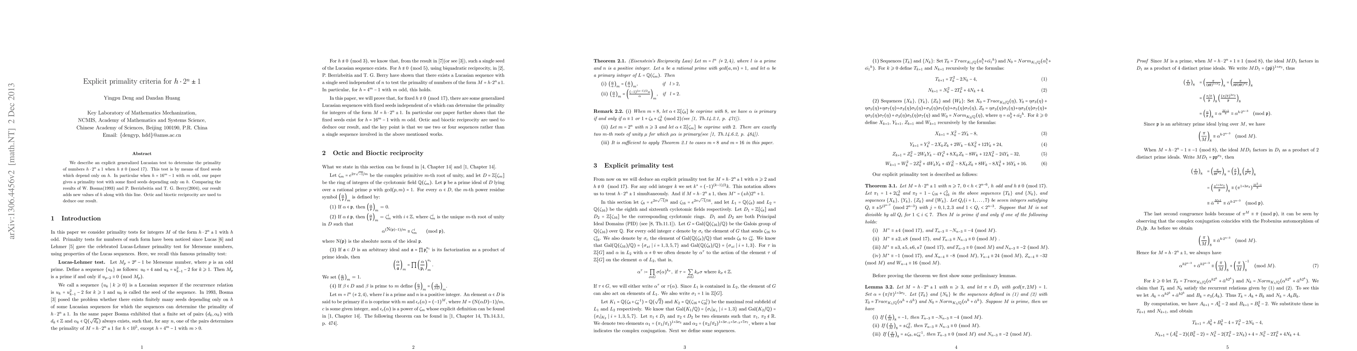 We describe an explicit generalized Lucasian test to determine the primality of numbers $h\cdot2^n\pm1$ when $h\nequiv0\pmod{17}$. This test is by means of fixed seeds which depend only on $h$. In particular when $h=16^m-1$ with $m$ odd, our paper gives a primality test with some fixed seeds depending only on $h$. Comparing the results of W. Bosma(1993) and P. Berrizbeitia and T. G. Berry(2004), our result adds new values of $h$ along with this line. Octic and bioctic reciprocity are used to deduce our result.