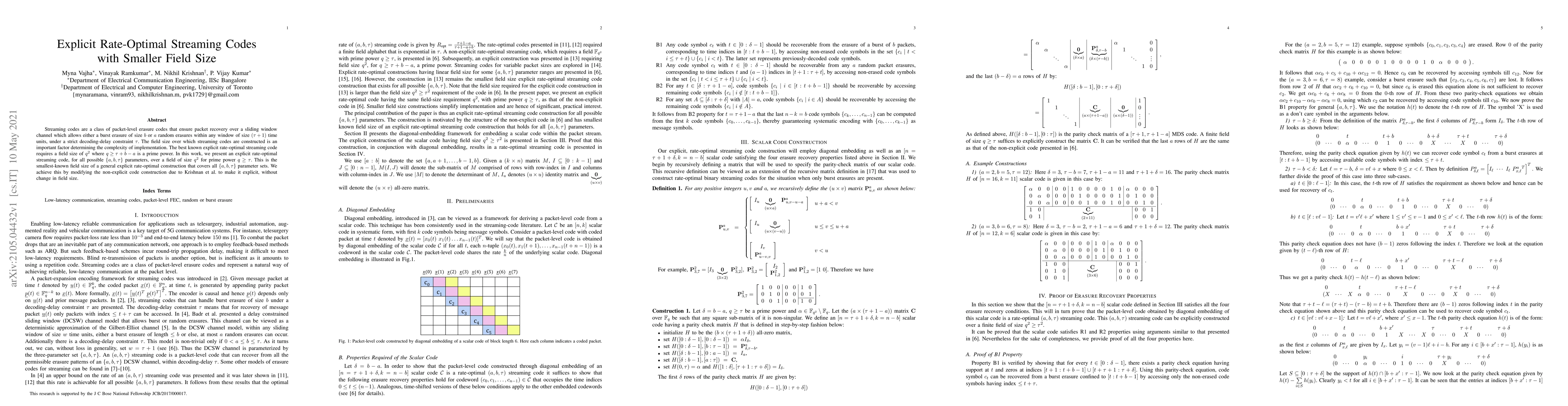 Streaming codes are a class of packet-level erasure codes that ensure packet recovery over a sliding window channel which allows either a burst erasure of size $b$ or $a$ random erasures within any window of size $(\tau+1)$ time units, under a strict decoding-delay constraint $\tau$. The field size over which streaming codes are constructed is an important factor determining the complexity of implementation. The best known explicit rate-optimal streaming code requires a field size of $q^2$ where $q \ge \tau+b-a$ is a prime power. In this work, we present an explicit rate-optimal streaming code, for all possible $\{a,b,\tau\}$ parameters, over a field of size $q^2$ for prime power $q \ge \tau$. This is the smallest-known field size of a general explicit rate-optimal construction that covers all $\{a,b,\tau\}$ parameter sets. We achieve this by modifying the non-explicit code construction due to Krishnan et al. to make it explicit, without change in field size.
