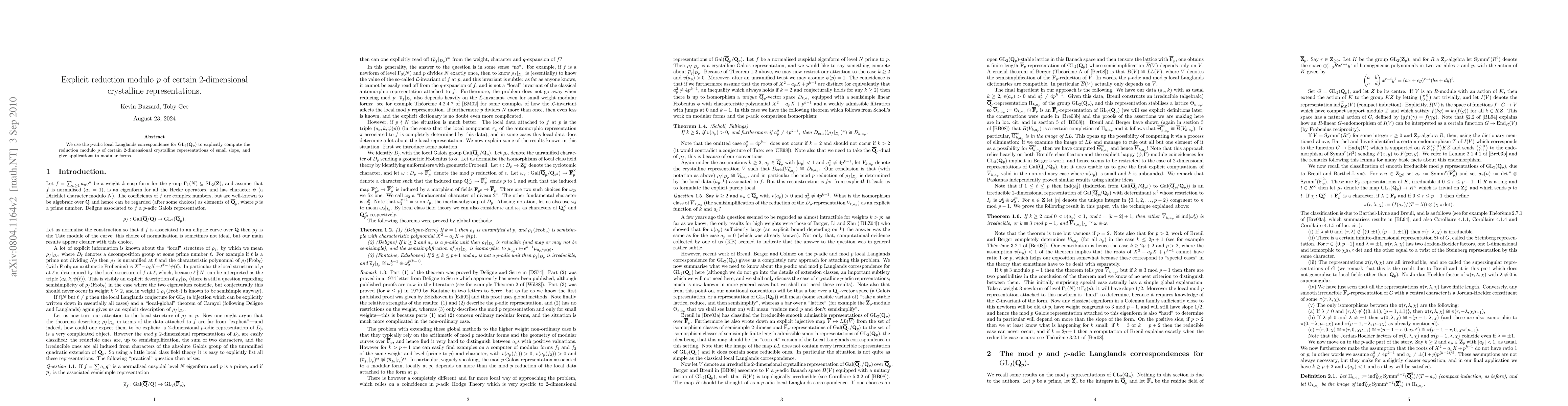 Summary: This paper applies the p-adic local Langlands correspondence for GL_2(Q_p) to explicitly compute reductions modulo p of crystalline representations with small slope, and explores applications to modular forms. The results provide deeper insights into the connections between these representations and modular forms.