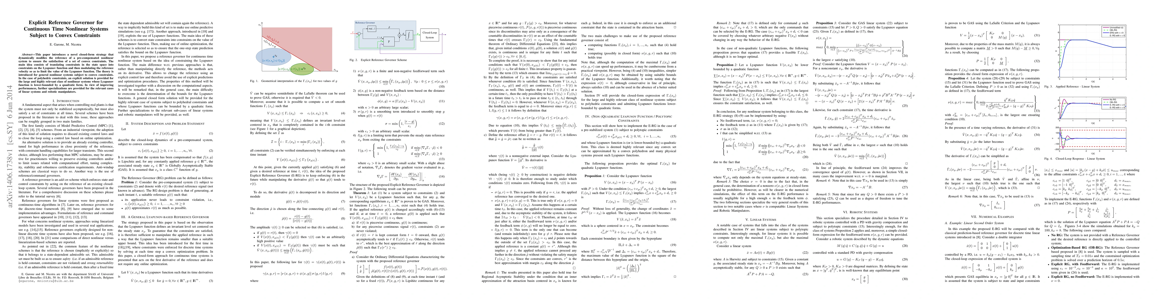 This paper introduces a novel closed-form strategy that dynamically modifies the reference of a pre-compensated nonlinear system to ensure the satisfaction of a set of convex constraints. The main idea consists of translating constraints in the state space into constraints on the Lyapunov function and then modulating the reference velocity so as to limit the value of the Lyapunov function. The theory is introduced for general nonlinear systems subject to convex constraints. In the case of polyhedric constraints, an explicit solution is provided for the large and highly relevant class of nonlinear systems whose Lyapunov function is lower-bounded by a quadratic form. In view of improving performances, further specializations are provided for the relevant cases of linear systems and robotic manipulators.