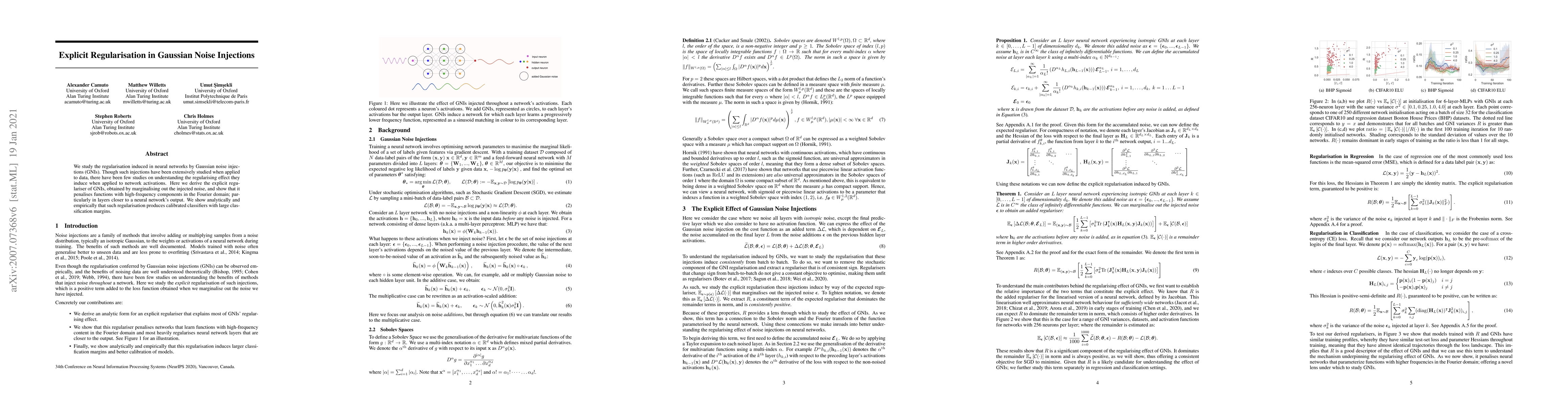 This paper investigates the regularisation effect of Gaussian noise injections applied directly to neural network activations, deriving an explicit regulariser that penalises high-frequency components, especially in output layers. The study finds that this method produces calibrated classifiers with significant classification margins.