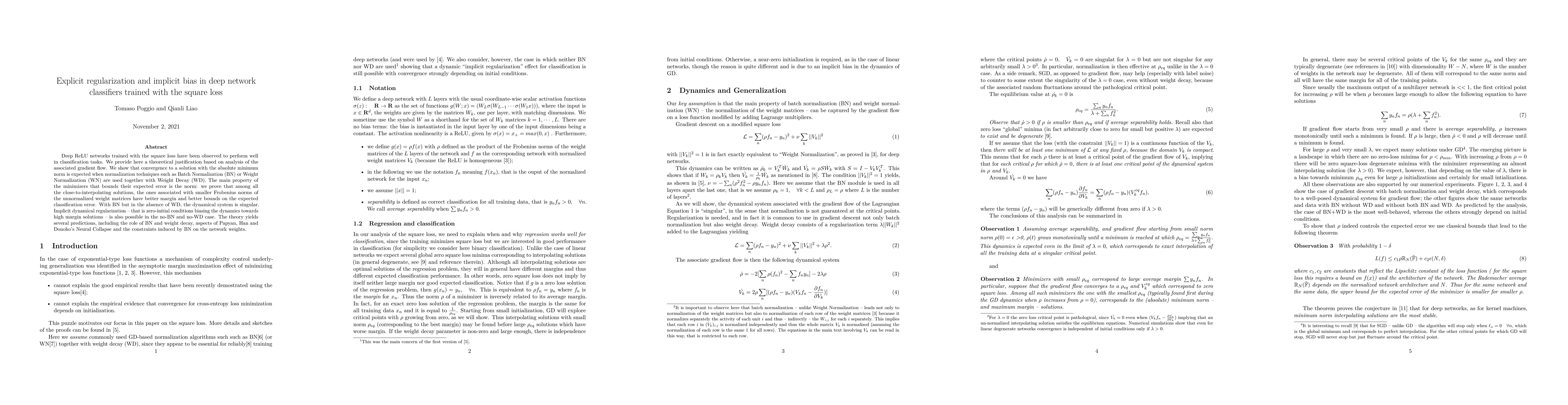 Deep ReLU networks trained with the square loss have been observed to perform well in classification tasks. We provide here a theoretical justification based on analysis of the associated gradient flow. We show that convergence to a solution with the absolute minimum norm is expected when normalization techniques such as Batch Normalization (BN) or Weight Normalization (WN) are used together with Weight Decay (WD). The main property of the minimizers that bounds their expected error is the norm: we prove that among all the close-to-interpolating solutions, the ones associated with smaller Frobenius norms of the unnormalized weight matrices have better margin and better bounds on the expected classification error. With BN but in the absence of WD, the dynamical system is singular. Implicit dynamical regularization -- that is zero-initial conditions biasing the dynamics towards high margin solutions -- is also possible in the no-BN and no-WD case. The theory yields several predictions, including the role of BN and weight decay, aspects of Papyan, Han and Donoho's Neural Collapse and the constraints induced by BN on the network weights.
