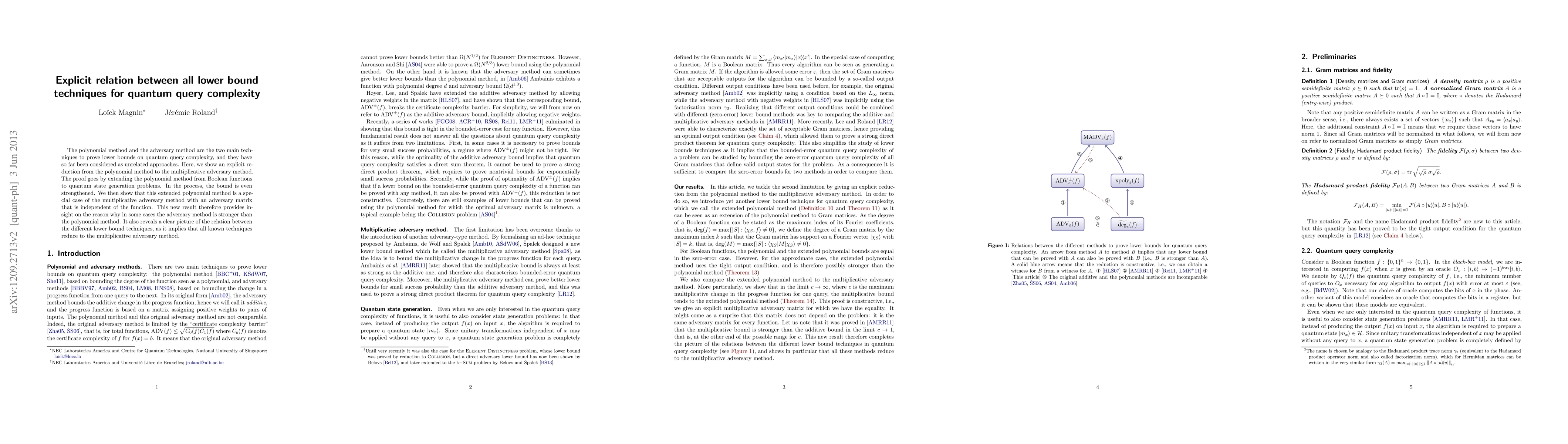 This paper establishes an explicit reduction between two lower bound techniques for quantum query complexity: the polynomial method and the multiplicative adversary method. It reveals a clear picture of their relation, showing that all known techniques reduce to the adversary method.