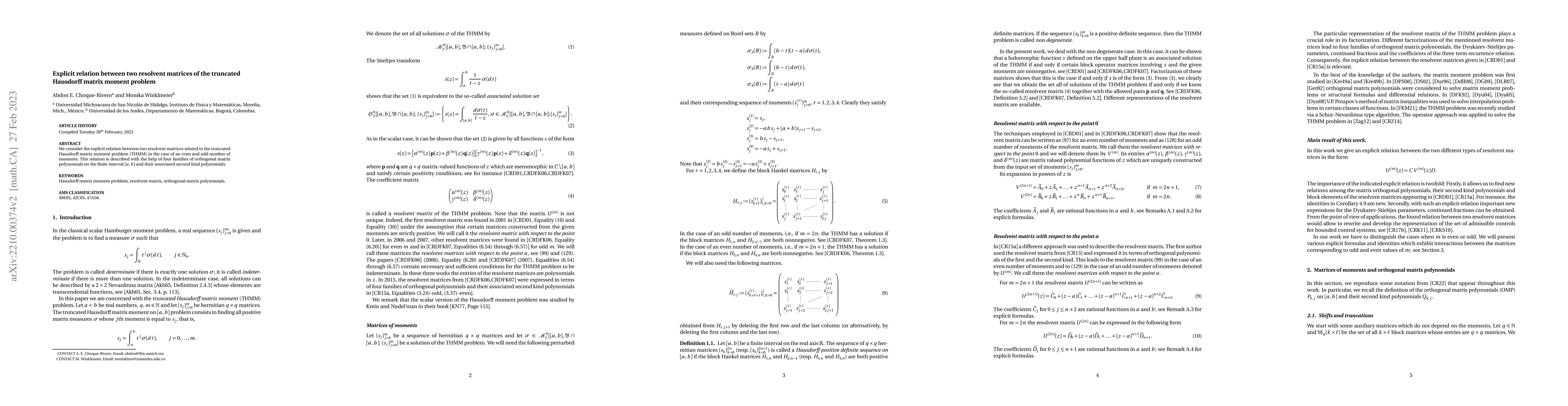 Summary: This paper establishes an explicit relation between two resolvent matrices in the truncated Hausdorff matrix moment problem, distinguishing cases for even and odd moments, and utilizes four families of orthogonal matrix polynomials and their associated second kind polynomials to describe this relation.