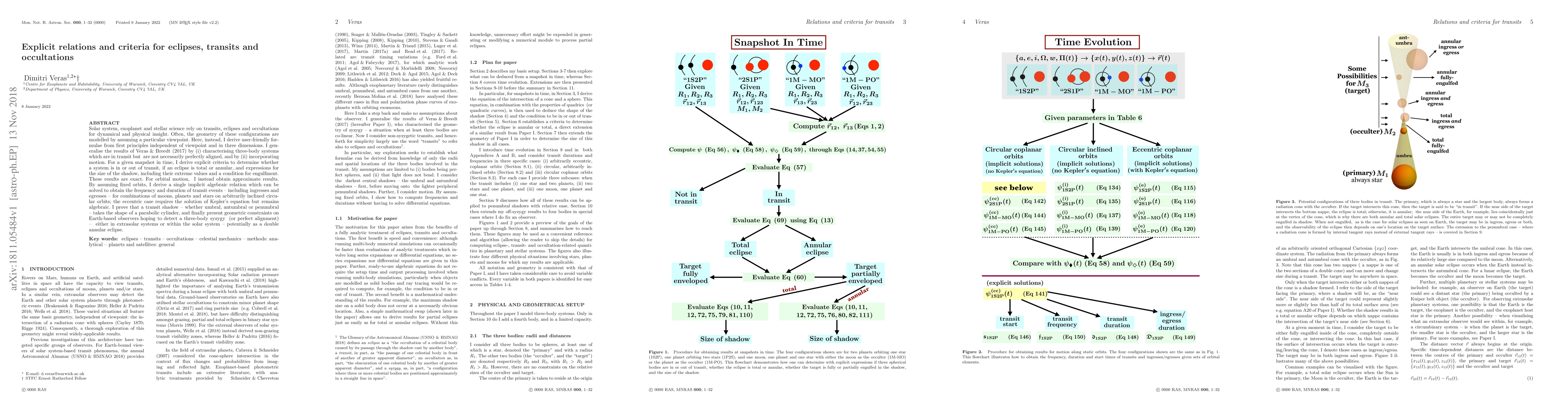 Solar system, exoplanet and stellar science rely on transits, eclipses and occultations for dynamical and physical insight. Often, the geometry of these configurations are modelled by assuming a particular viewpoint. Here, instead, I derive user-friendly formulae from first principles independent of viewpoint and in three dimensions. I generalise the results of Veras & Breedt (2017) by (i) characterising three-body systems which are in transit but are not necessarily perfectly aligned, and by (ii) incorporating motion. For a given snapshot in time, I derive explicit criteria to determine whether a system is in or out of transit, if an eclipse is total or annular, and expressions for the size of the shadow, including their extreme values and a condition for engulfment. These results are exact. For orbital motion, I instead obtain approximate results. By assuming fixed orbits, I derive a single implicit algebraic relation which can be solved to obtain the frequency and duration of transit events -- including ingresses and egresses -- for combinations of moons, planets and stars on arbitrarily inclined circular orbits; the eccentric case requires the solution of Kepler's equation but remains algebraic. I prove that a transit shadow -- whether umbral, antumbral or penumbral -- takes the shape of a parabolic cylinder, and finally present geometric constraints on Earth-based observers hoping to detect a three-body syzygy (or perfect alignment) -- either in extrasolar systems or within the solar system -- potentially as a double annular eclipse.