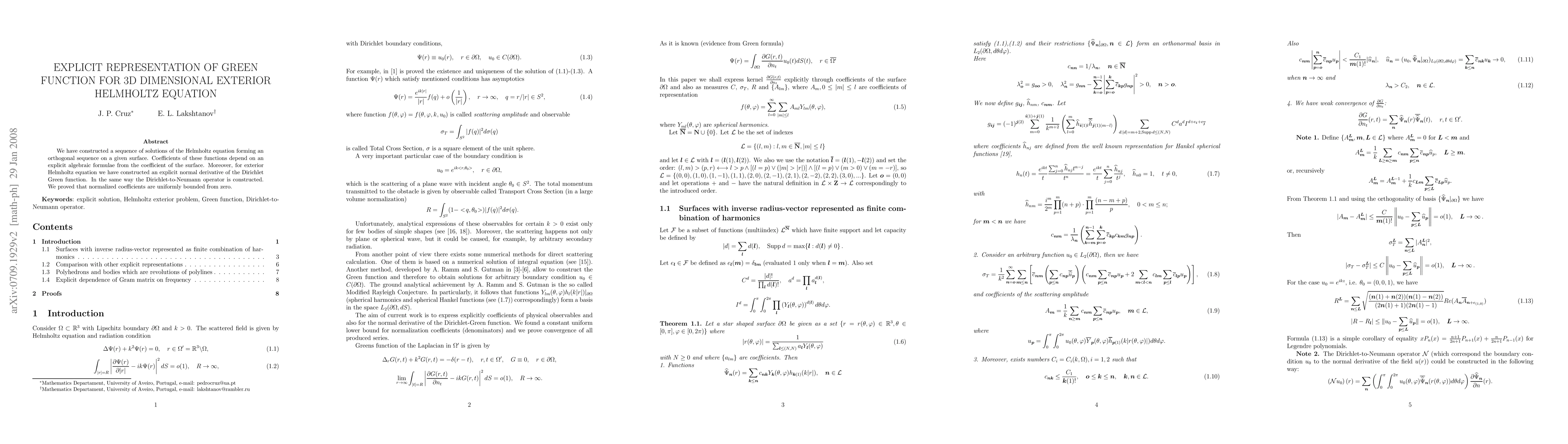 We have constructed a sequence of solutions of the Helmholtz equation forming an orthogonal sequence on a given surface. Coefficients of these functions depend on an explicit algebraic formulae from the coefficient of the surface. Moreover, for exterior Helmholtz equation we have constructed an explicit normal derivative of the Dirichlet Green function. In the same way the Dirichlet-to-Neumann operator is constructed. We proved that normalized coefficients are uniformly bounded from zero.