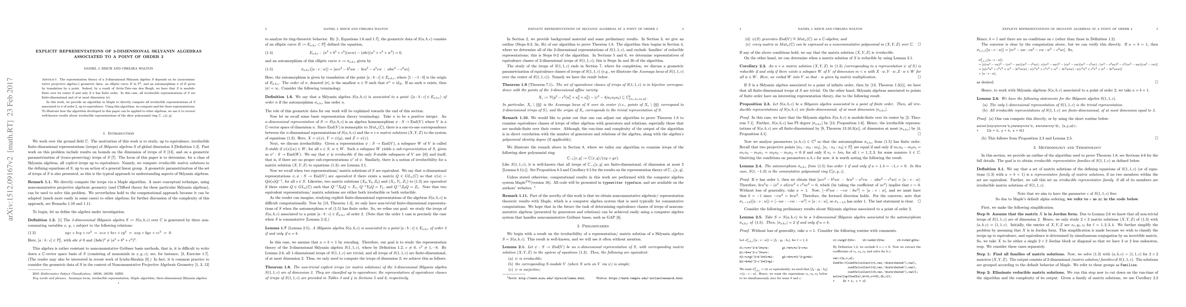 The representation theory of a 3-dimensional Sklyanin algebra $S$ depends on its (noncommutative projective algebro-) geometric data: an elliptic curve $E$ in $\mathbb{P}^2$, and an automorphism $\sigma$ of $E$ given by translation by a point. Indeed, by a result of Artin-Tate-van den Bergh, we have that $S$ is module-finite over its center if and only if $\sigma$ has finite order. In this case, all irreducible representations of $S$ are finite-dimensional and of at most dimension $|\sigma|$. In this work, we provide an algorithm in Maple to directly compute all irreducible representations of $S$ associated to $\sigma$ of order 2, up to equivalence. Using this algorithm, we compute and list these representations. To illustrate how the algorithm developed in this paper can be applied to other algebras, we use it to recover well-known results about irreducible representations of the skew polynomial ring $\mathbb{C}_{-1}[x,y]$.