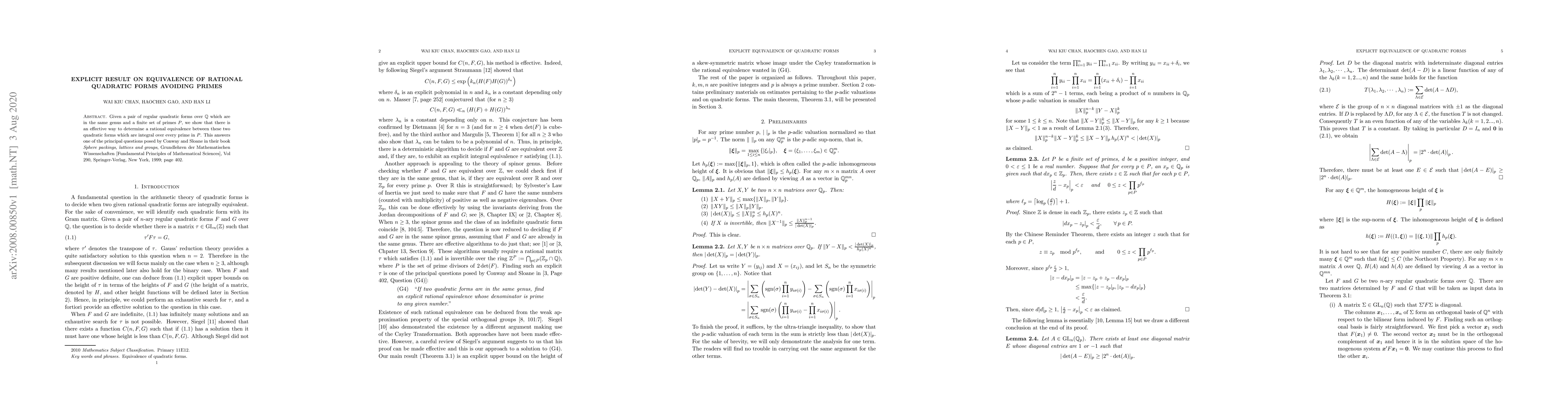 Given a pair of regular quadratic forms over $\mathbb{Q}$ which are in the same genus and a finite set of primes $P$, we show that there is an effective way to determine a rational equivalence between these two quadratic forms which are integral over every prime in $P$. This answers one of the principal questions posed by Conway and Sloane in their book {\em Sphere packings, lattices and groups}, Grundlehren der Mathematischen Wissenschaften [Fundamental Principles of Mathematical Sciences], Vol 290, Springer-Verlag, New York, 1999; page 402.