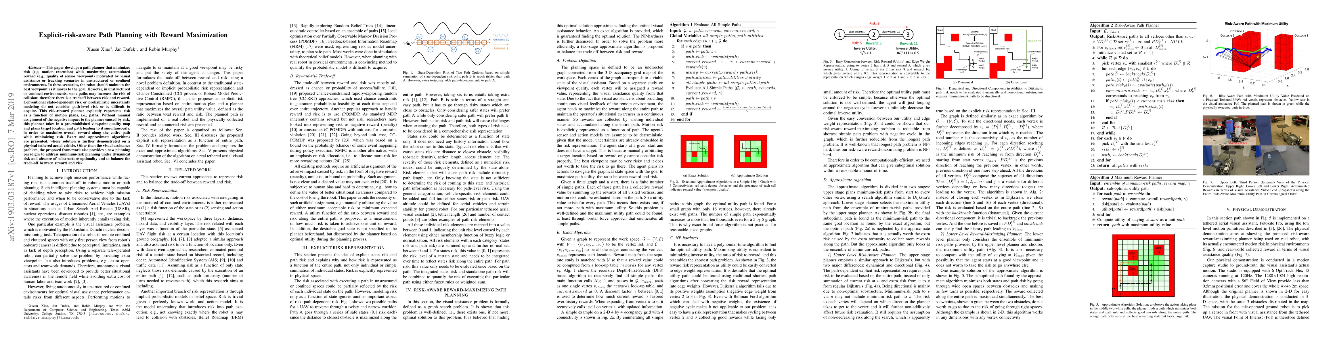 This paper proposes a path planning method that balances risk minimization with reward maximization, particularly for visual assistance or tracking tasks in unstructured environments. It introduces explicit risk modeling for paths and demonstrates both exact and approximate algorithms, validated on a tethered aerial vehicle.