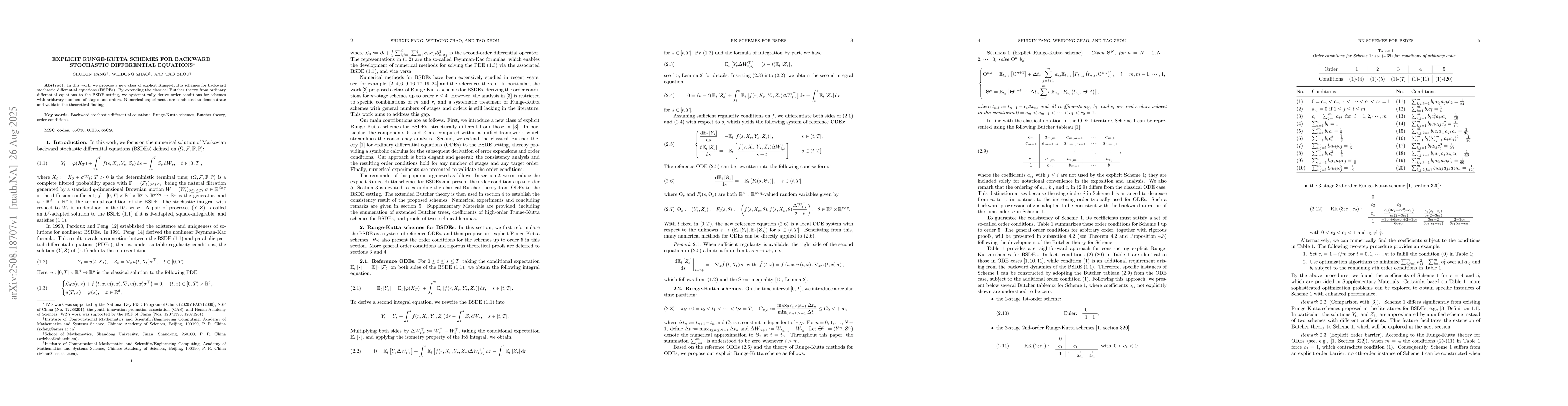 In this work, we propose a new class of explicit Runge-Kutta schemes for backward stochastic differential equations (BSDEs). By extending the classical Butcher theory from ordinary differential equations to the BSDE setting, we systematically derive order conditions for schemes with arbitrary numbers of stages and orders. Numerical experiments are conducted to demonstrate and validate the theoretical findings.