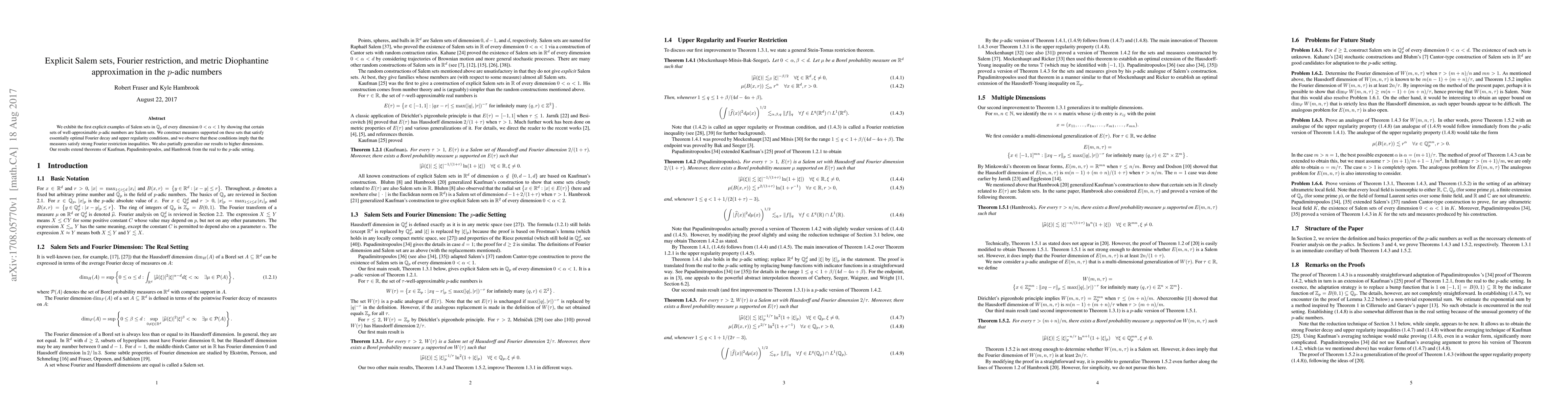 We exhibit the first explicit examples of Salem sets in $\mathbb{Q}_p$ of every dimension $0 < \alpha < 1$ by showing that certain sets of well-approximable $p$-adic numbers are Salem sets. We construct measures supported on these sets that satisfy essentially optimal Fourier decay and upper regularity conditions, and we observe that these conditions imply that the measures satisfy strong Fourier restriction inequalities. We also partially generalize our results to higher dimensions. Our results extend theorems of Kaufman, Papadimitropoulos, and Hambrook from the real to the $p$-adic setting.