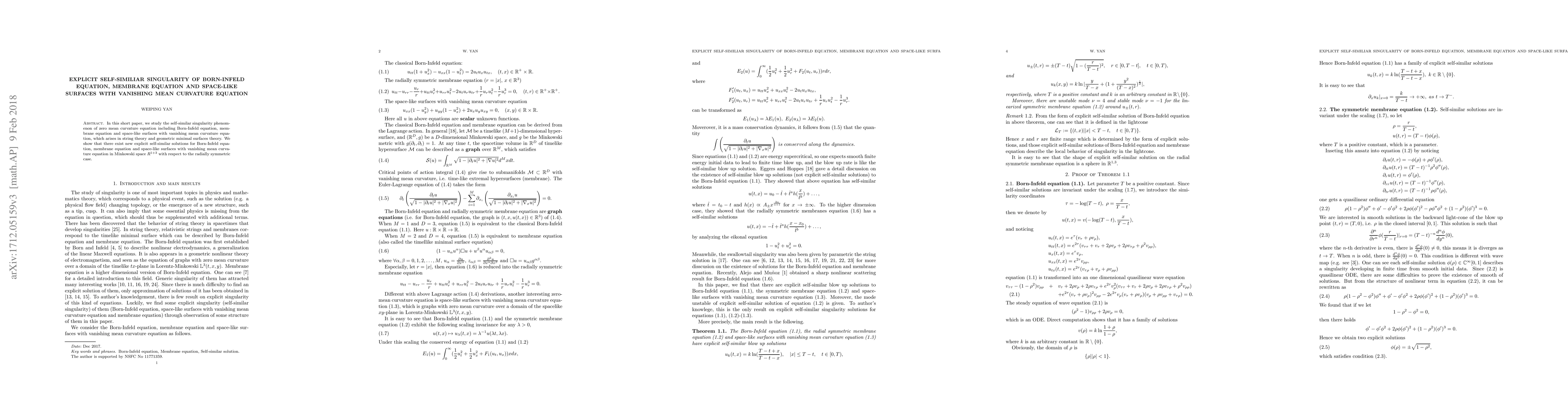 This paper identifies new explicit self-similar solutions for the Born-Infeld equation, space-like surfaces with vanishing mean curvature, and the membrane equation in Minkowski space, specifically focusing on radially symmetric cases. These solutions are significant in string theory and geometric minimal surfaces theory.