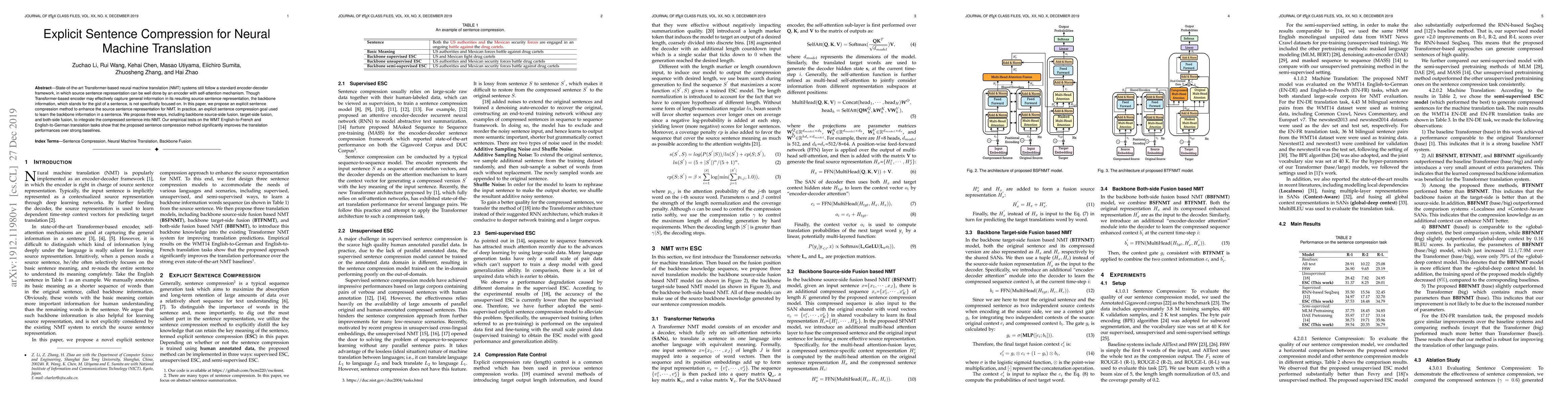 This paper proposes an explicit sentence compression method to enhance source sentence representation in Transformer-based neural machine translation (NMT). The method integrates compressed sentence representations through backbone source-side fusion, target-side fusion, and both-side fusion, leading to significant improvements in translation performance on WMT English-to-French and English-to-German tasks.