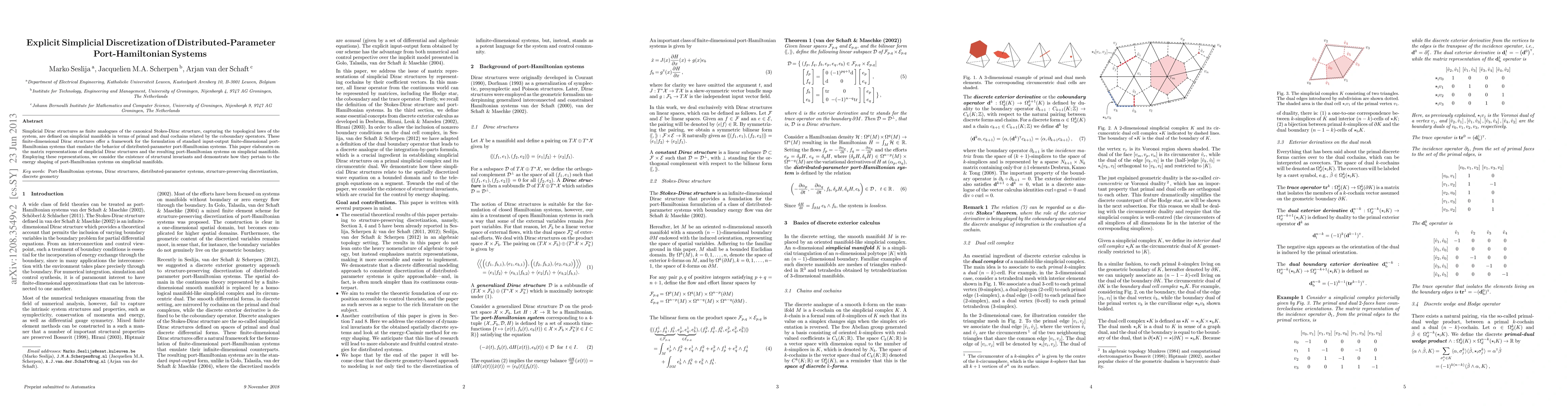 This paper defines simplicial Dirac structures on simplicial manifolds to model distributed-parameter port-Hamiltonian systems, providing matrix representations and exploring their structural invariants and implications for energy shaping. The approach uses primal and dual cochains related by coboundary operators to emulate distributed-parameter systems.