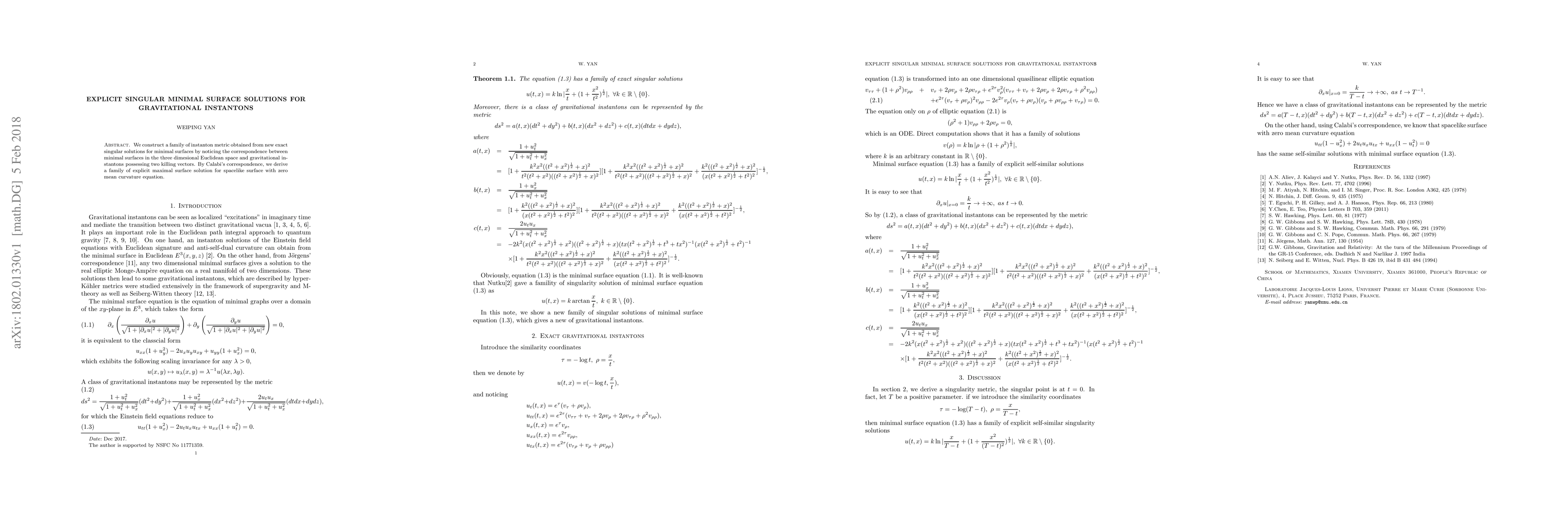 We construct a family of instanton metric obtained from new exact singular solutions for minimal surfaces by noticing the correspondence between minimal surfaces in the three dimesional Euclidean space and gravitational instantons possessing two killing vectors. By Calabi's correspondence, we derive a family of explicit maximal surface solution for spacelike surface with zero mean curvature equation.