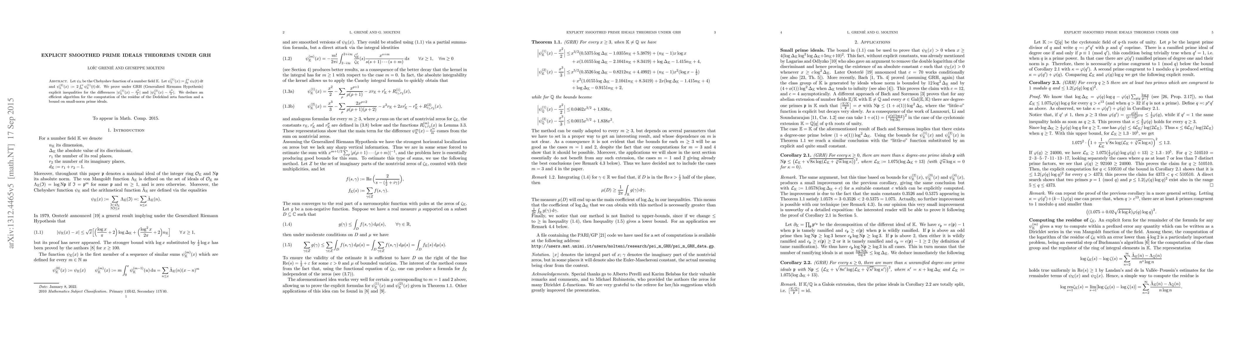 Let $\psi_{\mathbb K}$ be the Chebyshev function of a number field $\mathbb K$. Let $\psi^{(1)}_{\mathbb K}(x):=\int_{0}^{x}\psi_{\mathbb K}(t)\,d t$ and $\psi^{(2)}_{\mathbb K}(x):=2\int_{0}^{x}\psi^{(1)}_{\mathbb K}(t)\,d t$. We prove under GRH explicit inequalities for the differences $|\psi^{(1)}_{\mathbb K}(x) - \tfrac{x^2}{2}|$ and $|\psi^{(2)}_{\mathbb K}(x) - \tfrac{x^3}{3}|$. We deduce an efficient algorithm for the computation of the residue of the Dedekind zeta function and a bound on small-norm prime ideals.