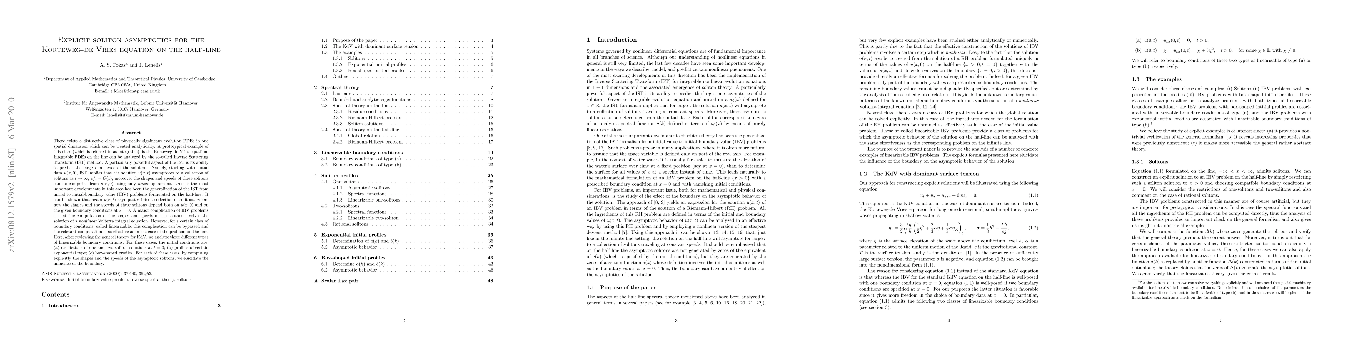 Integrable PDEs on the line can be analyzed by the so-called Inverse Scattering Transform (IST) method. A particularly powerful aspect of the IST is its ability to predict the large $t$ behavior of the solution. Namely, starting with initial data $u(x,0)$, IST implies that the solution $u(x,t)$ asymptotes to a collection of solitons as $t \to \infty$, $x/t = O(1)$; moreover the shapes and speeds of these solitons can be computed from $u(x,0)$ using only {\it linear} operations. One of the most important developments in this area has been the generalization of the IST from initial to initial-boundary value (IBV) problems formulated on the half-line. It can be shown that again $u(x,t)$ asymptotes into a collection of solitons, where now the shapes and the speeds of these solitons depend both on $u(x,0)$ and on the given boundary conditions at $x = 0$. A major complication of IBV problems is that the computation of the shapes and speeds of the solitons involves the solution of a {\it nonlinear} Volterra integral equation. However, for a certain class of boundary conditions, called linearizable, this complication can be bypassed and the relevant computation is as effective as in the case of the problem on the line. Here, after reviewing the general theory for KdV, we analyze three different types of linearizable boundary conditions. For these cases, the initial conditions are: (a) restrictions of one and two soliton solutions at $t = 0$; (b) profiles of certain exponential type; (c) box-shaped profiles. For each of these cases, by computing explicitly the shapes and the speeds of the asymptotic solitons, we elucidate the influence of the boundary.