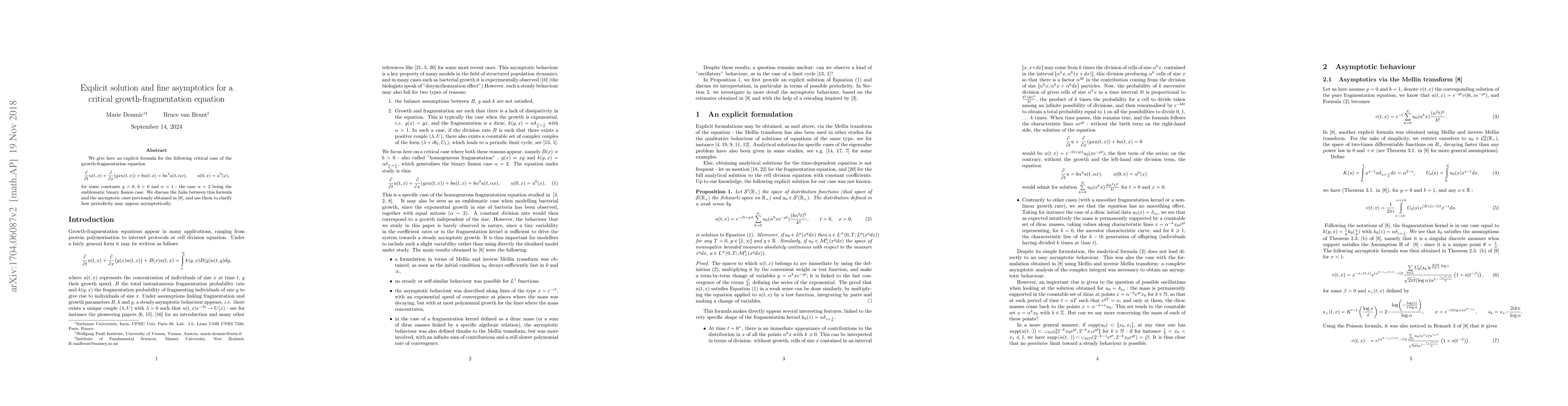 This paper provides an explicit solution for the critical growth-fragmentation equation, particularly focusing on the case where the growth factor equals 2, representing binary fission. It also explores the asymptotic behavior and links to previously obtained results to elucidate the emergence of periodic patterns.