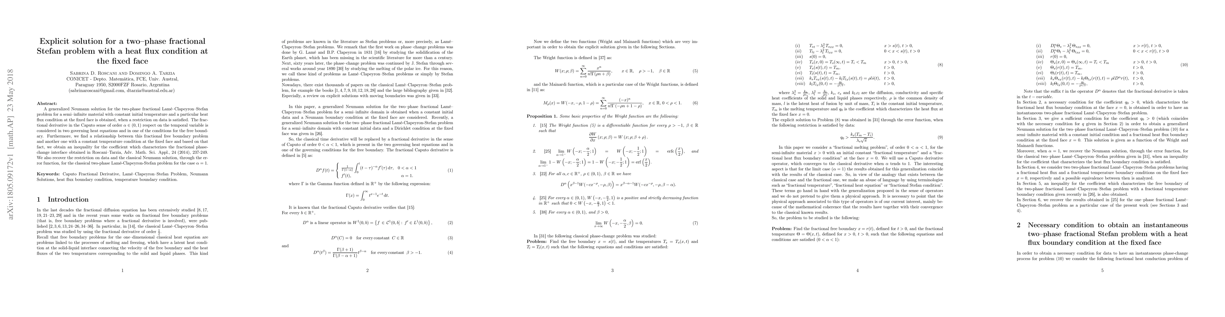 This paper provides an explicit solution for a two-phase fractional Stefan problem with a heat flux condition at a fixed face, using a generalized Neumann approach. It also establishes a relationship between this fractional problem and a classical one, deriving an inequality for the coefficient characterizing the fractional phase-change interface.