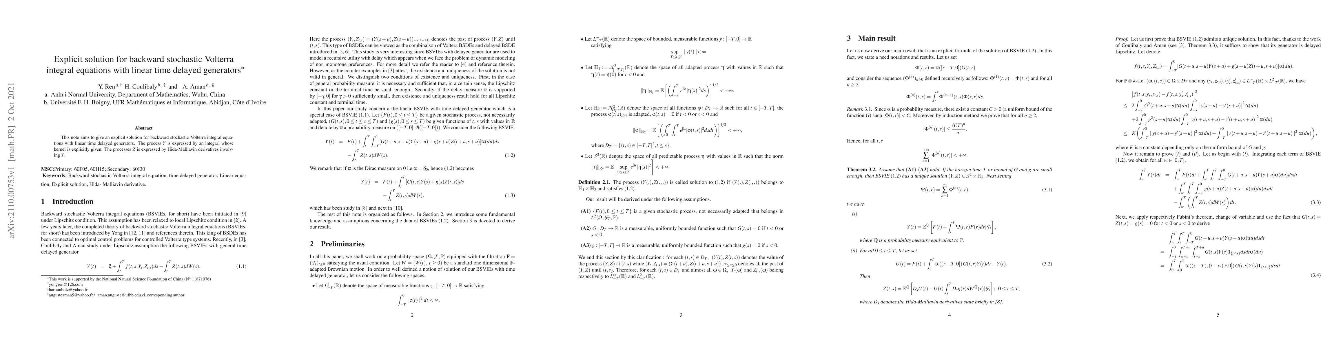 Summary: This paper provides an explicit solution for backward stochastic Volterra integral equations featuring linear time delays. It expresses the process $Y$ through an integral with a specified kernel and defines the process $Z$ using Hida-Malliavin derivatives linked to $Y$.