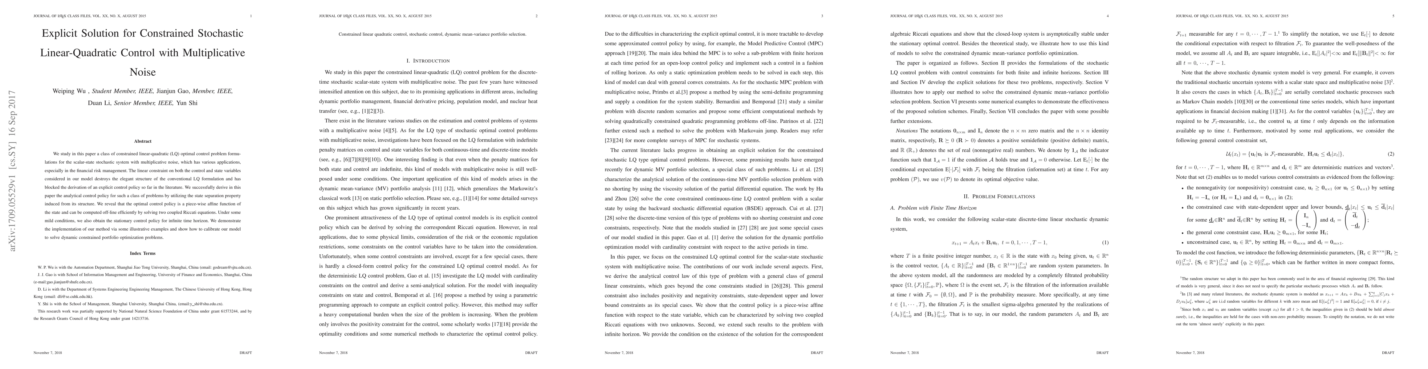 This paper derives an explicit analytical control policy for constrained linear-quadratic stochastic control problems with multiplicative noise, revealing a piece-wise affine optimal control function. The method involves solving two coupled Riccati equations and is demonstrated through dynamic portfolio optimization examples.