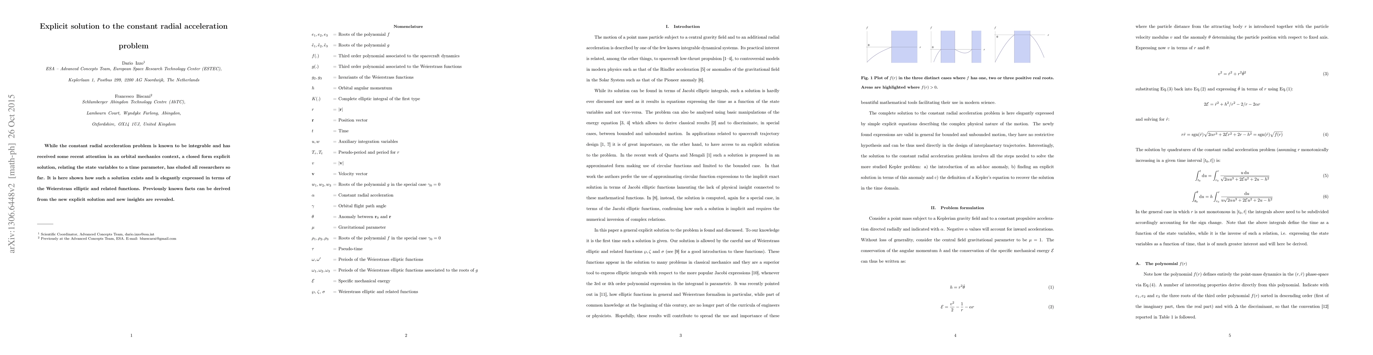 This paper presents the first explicit solution to the constant radial acceleration problem in orbital mechanics, expressed elegantly using Weierstrass elliptic functions, allowing derivation of previously known facts and unveiling new insights.