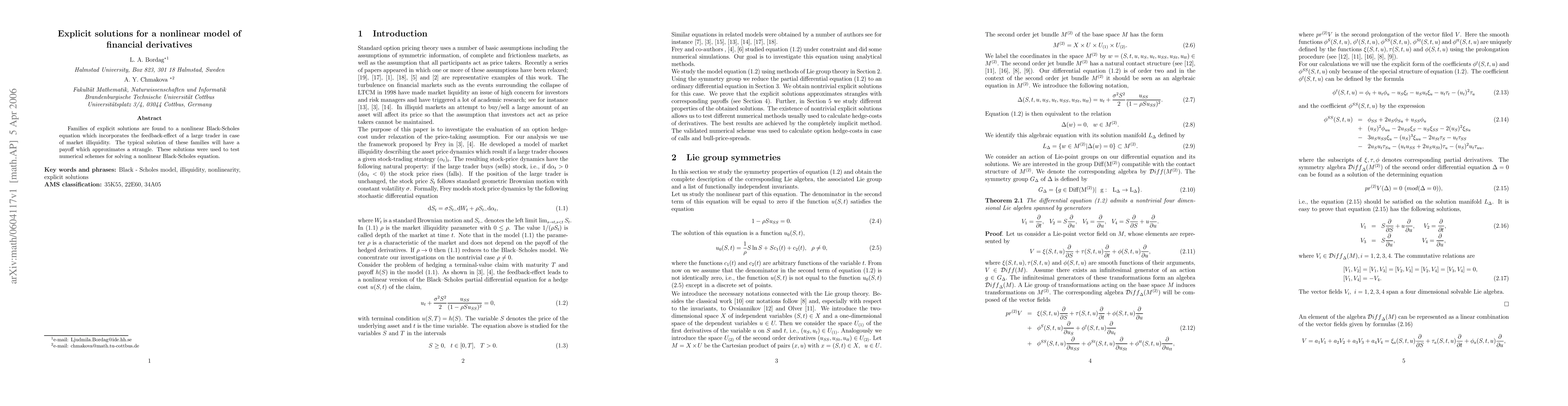 Families of explicit solutions are found to a nonlinear Black-Scholes equation which incorporates the feedback-effect of a large trader in case of market illiquidity. The typical solution of these families will have a payoff which approximates a strangle. These solutions were used to test numerical schemes for solving a nonlinear Black-Scholes equation.