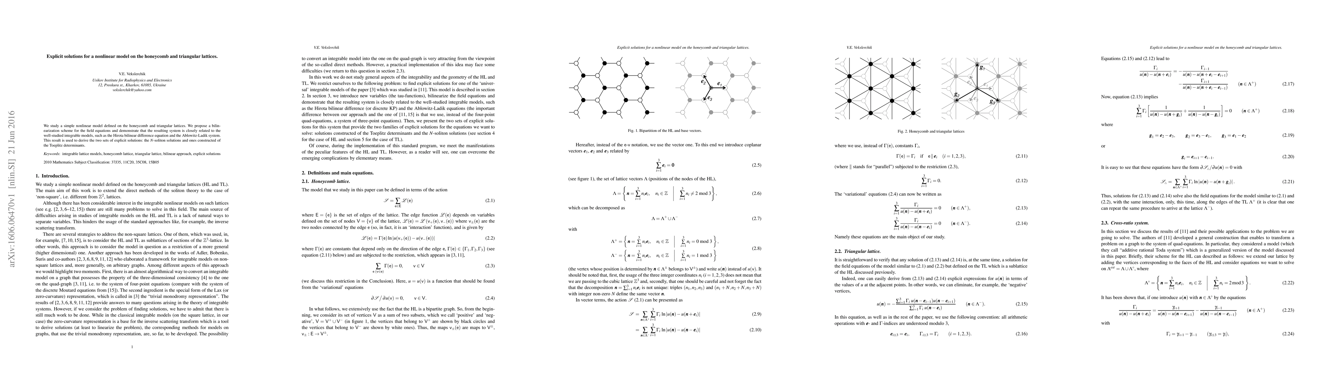 We study a simple nonlinear model defined on the honeycomb and triangular lattices. We propose a bilinearization scheme for the field equations and demonstrate that the resulting system is closely related to the well-studied integrable models, such as the Hirota bilinear difference equation and the Ablowitz-Ladik system. This result is used to derive the two sets of explicit solutions: the N-soliton solutions and ones constructed of the Toeplitz determinants.