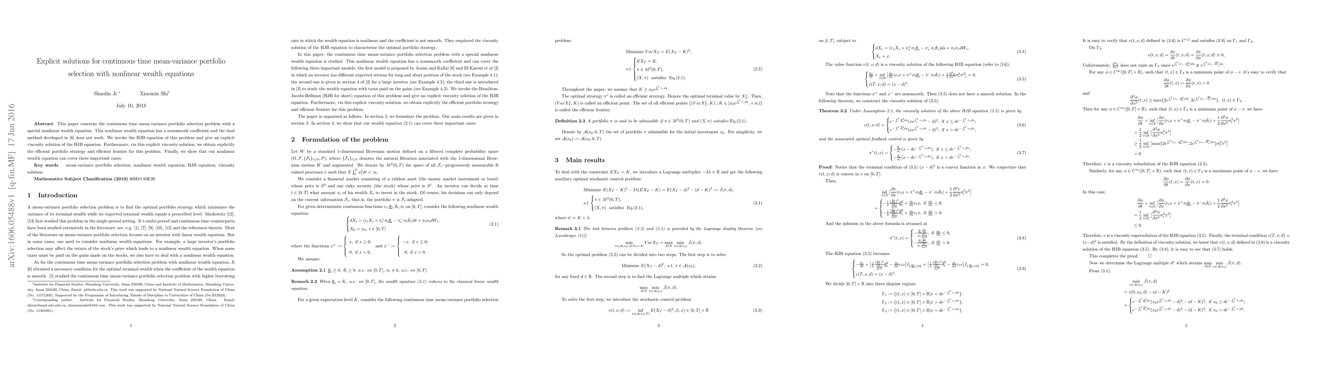This paper provides explicit solutions for the continuous time mean-variance portfolio selection problem using a nonlinear wealth equation with a nonsmooth coefficient. It derives an explicit viscosity solution to the Hamilton-Jacobi-Bellman (HJB) equation, obtaining the efficient portfolio strategy and efficient frontier.