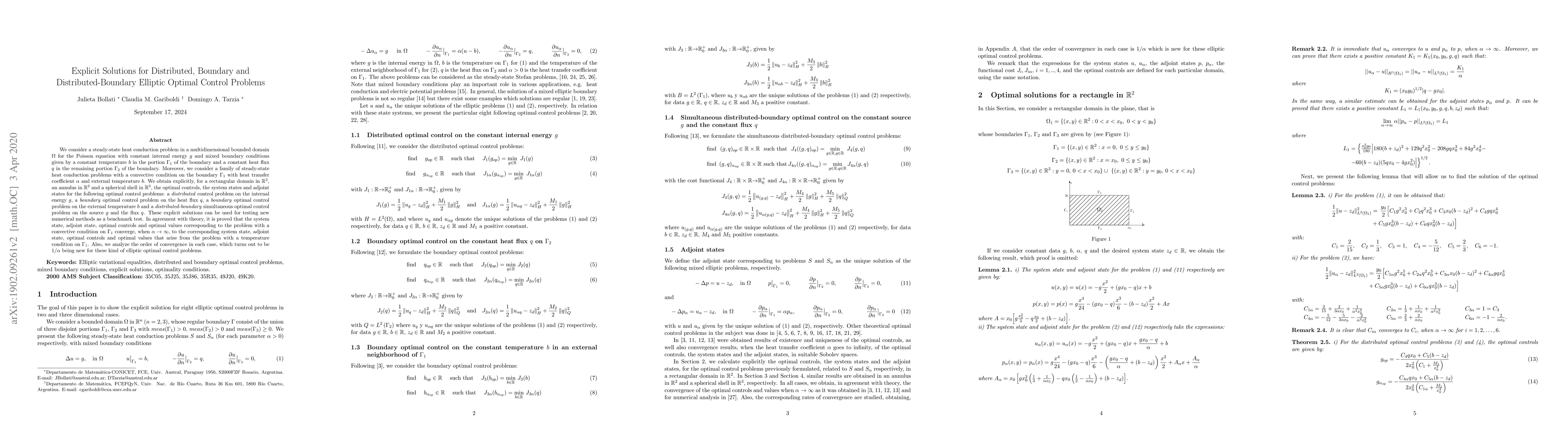 We consider a steady-state heat conduction problem in a multidimensional bounded domain Omega for the Poisson equation with constant internal energy g and mixed boundary conditions given by a constant temperature b in the portion Gamma_1 of the boundary and a constant heat flux q in the remaining portion Gamma_2 of the boundary. Moreover, we consider a family of steady-state heat conduction problems with a convective condition on the boundary Gamma_1 with heat transfer coefficient alpha and external temperature b. We obtain explicitly, for a rectangular domain in R^2, an annulus in R^2 and a spherical shell in R^3, the optimal controls, the system states and adjoint states for the following optimal control problems: a distributed control problem on the internal energy g, a boundary optimal control problem on the heat flux q, a boundary optimal control problem on the external temperature b and a distributed-boundary simultaneous optimal control problem on the source g and the flux q. These explicit solutions can be used for testing new numerical methods as a benchmark test. In agreement with theory, it is proved that the system state, adjoint state, optimal controls and optimal values corresponding to the problem with a convective condition on Gamma_1 converge, when alpha\to\infty, to the corresponding system state, adjoint state, optimal controls and optimal values that arise from the problem with a temperature condition on Gamma_1. Also, we analyze the order of convergence in each case, which turns out to be 1/alpha being new for these kind of elliptic optimal control problems.
