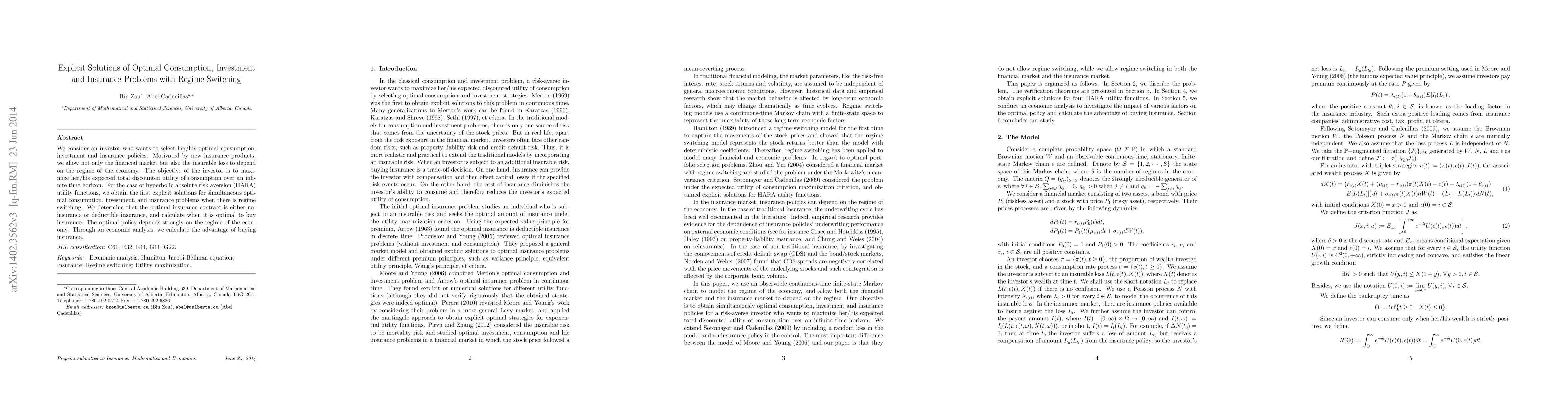 This paper derives explicit solutions for optimal consumption, investment, and insurance policies under regime-switching economic conditions, focusing on hyperbolic absolute risk aversion utility functions. It finds that the optimal insurance contract is either no-insurance or deductible insurance, with the choice heavily influenced by the economic regime.