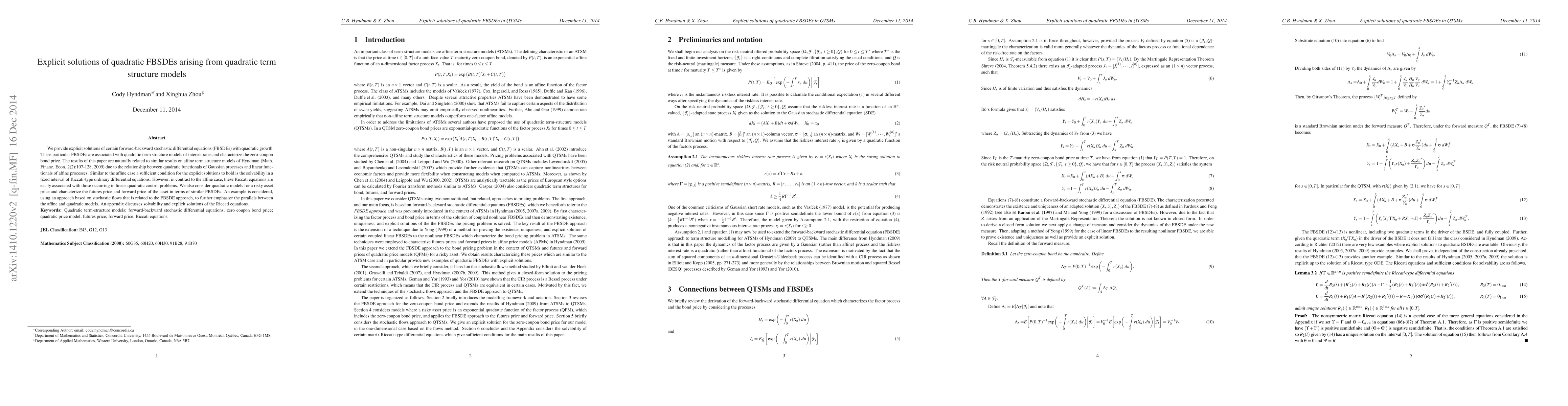 We provide explicit solutions of certain forward-backward stochastic differential equations (FBSDEs) with quadratic growth. These particular FBSDEs are associated with quadratic term structure models of interest rates and characterize the zero-coupon bond price. The results of this paper are naturally related to similar results on affine term structure models of Hyndman (Math. Financ. Econ. 2(2):107-128, 2009) due to the relationship between quadratic functionals of Gaussian processes and linear functionals of affine processes. Similar to the affine case a sufficient condition for the explicit solutions to hold is the solvability in a fixed interval of Riccati-type ordinary differential equations. However, in contrast to the affine case, these Riccati equations are easily associated with those occurring in linear-quadratic control problems. We also consider quadratic models for a risky asset price and characterize the futures price and forward price of the asset in terms of similar FBSDEs. An example is considered, using an approach based on stochastic flows that is related to the FBSDE approach, to further emphasize the parallels between the affine and quadratic models. An appendix discusses solvability and explicit solutions of the Riccati equations.