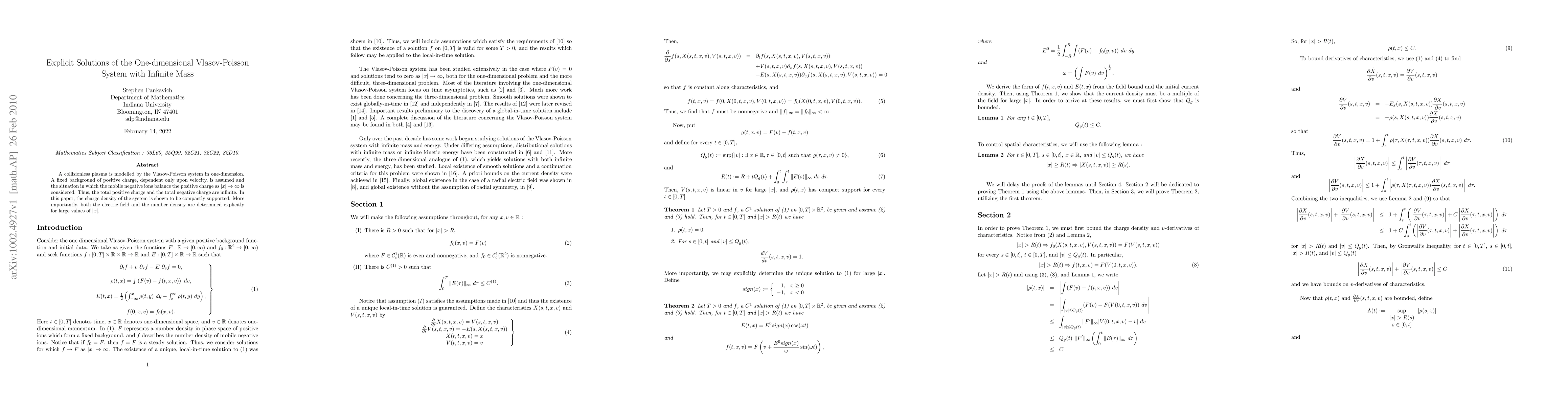 Researchers solve the Vlasov-Poisson system for a one-dimensional plasma with infinite mass and energy, finding explicit solutions for electric field and number density as x approaches infinity.