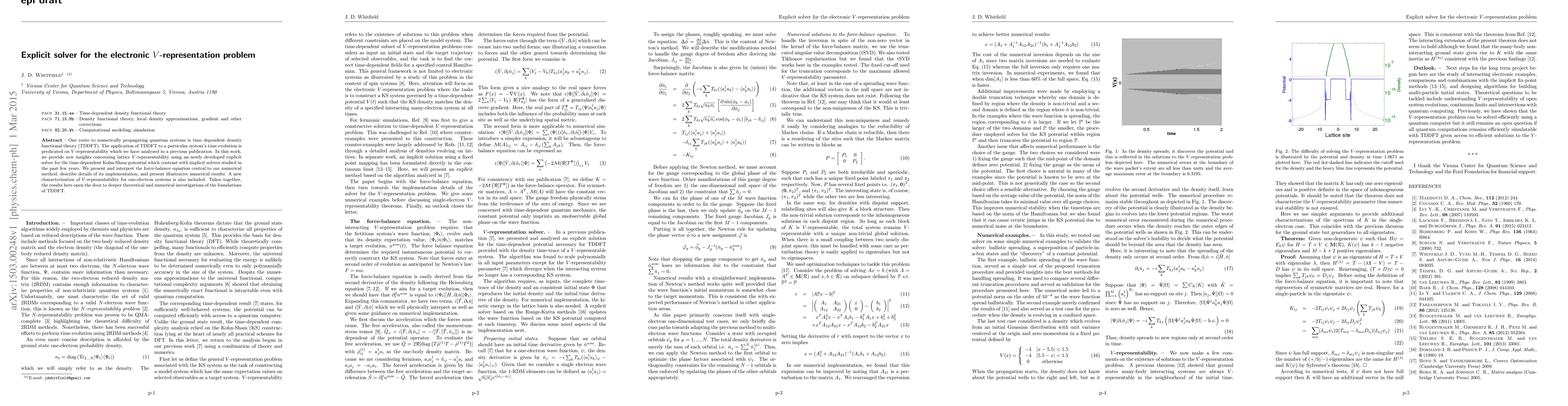 This paper introduces an explicit solver for the electronic V-representation problem in time-dependent density functional theory (TDDFT), contrasting with previous implicit solvers. The new method provides insights into lattice V-representability and presents a force-balance equation central to its numerical implementation, along with illustrative results and a new characterization of V-representability for one-electron systems.
