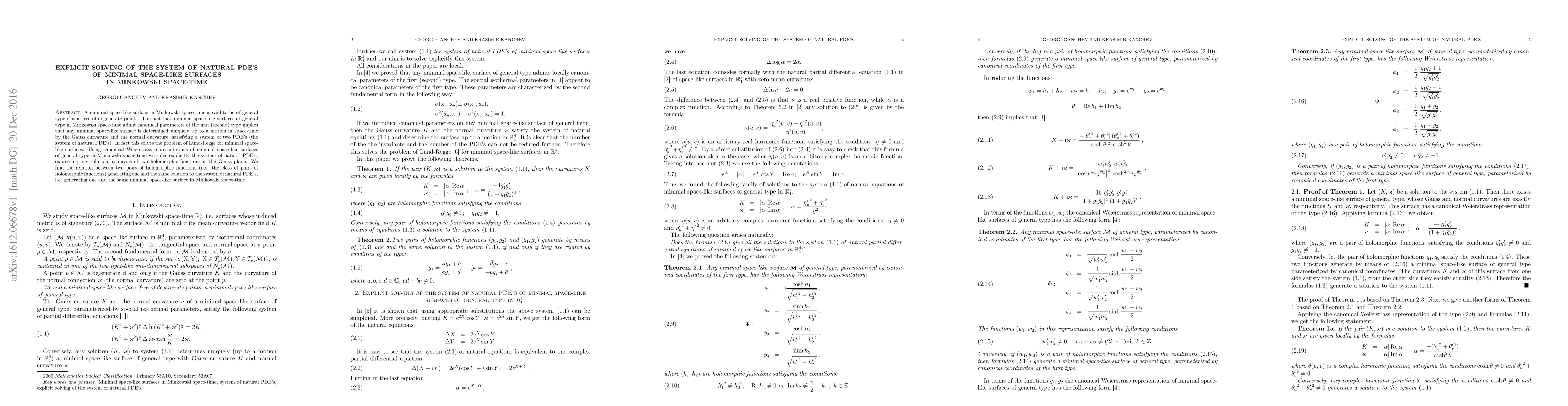 This paper explicitly solves the system of natural PDEs for minimal space-like surfaces in Minkowski space-time, determining them uniquely by Gauss and normal curvature. It uses canonical Weierstrass representations to express solutions in terms of two holomorphic functions, revealing the relation between pairs of these functions generating the same minimal surface.